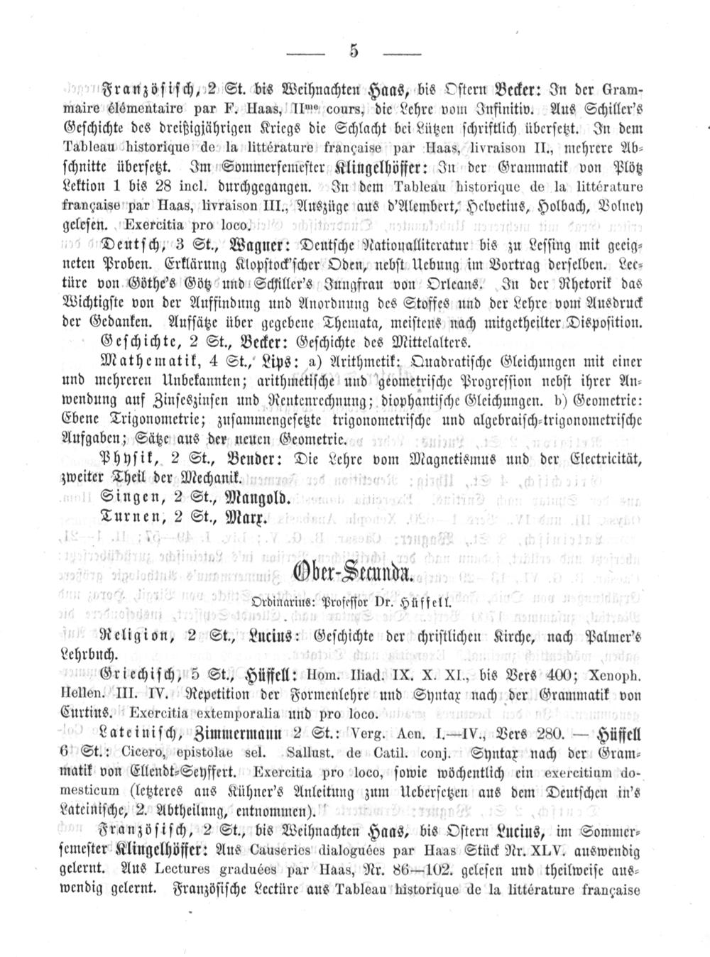 Griechiſch, 5 St., Hüffell: Hom. Iliad. IX. X. XI., bis Vers 400; Xenoph. Hellen. III. IV. Repetition der Formenlehre und Syntax nach der Grammatik von Curtius. Exercitia extemporalia und pro loco.