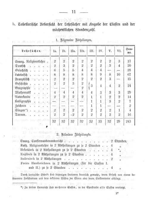 b. Tabellariſche Aeberſicht der Lehrfächer mit Angabe der Claſſen und der wöchentlichen Stundenzahl.