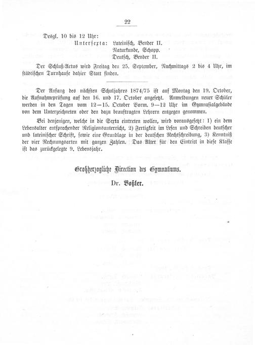 Der Anfang des nächſten Schuljahres 1874/75 iſt auf Montag den 19. October, die Aufnahmeprüfung auf den 16. und 17. October angeſetzt. Anmeldungen neuer Schüler werden in den Tagen vom 12— 15. October Vorm. 9— 12 Uhr im Gymnaſialgebände von dem Unterzeichneten oder den dazu beauftragten Lehrern entgegen genommen.