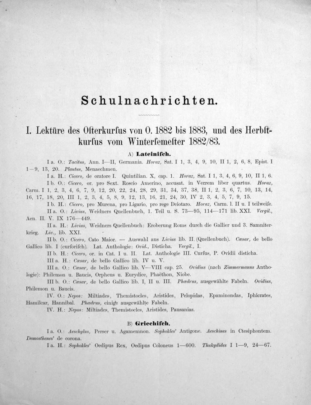 I. Lektüre des Oſterkurfus von O. 1882 bis 1883, und des Herbſt- kurfus vom Winterſfemeſter 1882/83.