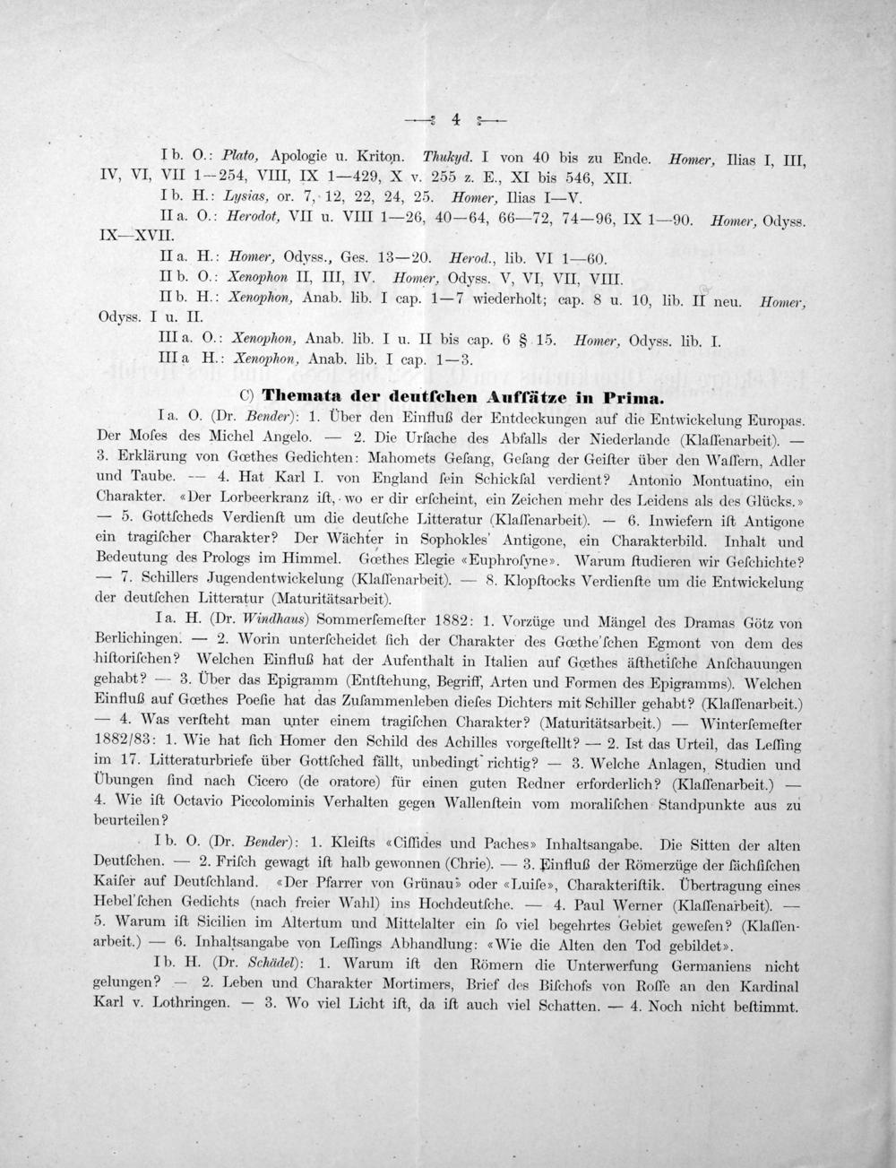 Ta. H.(Dr. Windhaus) Sommerſemeſter 1882: 1. Vorzüge und Mängel des Dramas Götz von Berlichingen.— 2. Worin unterſcheidet ſich der Charakter des Gœthe'ſchen Egmont von dem des hiſtoriſchen? Welchen Einfluß hat der Aufenthalt in Italien auf Gothes äſthetiſche Anſchauungen gehabt?— 3. Uber das Epigramm(Entſtehung, Begriff, Arten und Formen des Epigramms). Welchen Einfluß auf Gœthes Poeſie hat das Zufammenleben dieſes Dichters mit Schiller gehabt?(Klaffenarbeit.) — 4. Was verſteht man unter einem tragiſchen Charakter?(Maturitätsarbeit.)— Winterſemeſter 1882/83: 1. Wie hat ſich Homer den Schild des Achilles vorgeſtellt?— 2. Ist das Urteil, das Leſſing im 17. Litteraturbriefe über Gottſched fällt, unbedingt richtig?— 3. Welche Anlagen, Studien und UÜbungen ſind nach Cicero(de oratore) für einen guten Redner erforderlich?(Klaſfenarbeit.)— 4. Wie iſt Octavio Piccolominis Verhalten gegen Wallenſtein vom moraliſchen Standpunkte aus zu beurteilen?