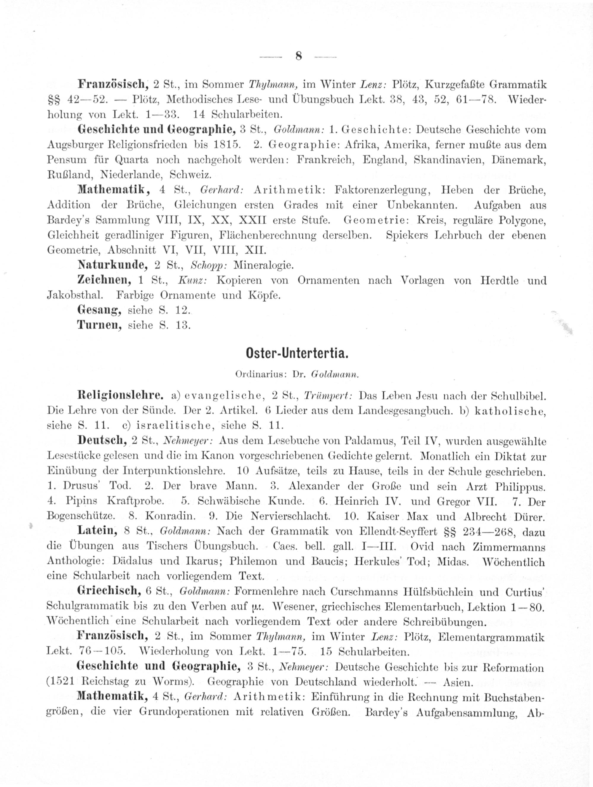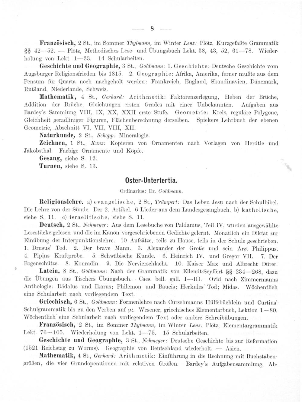 Geschichte und Geographie, 3 St., Goldmann: 1. Geschichte: Deutsche Geschichte vom Augsburger Religionsfrieden bis 1815. 2. Geographie: Afrika, Amerika, ferner mußte aus dem Pensum für Quarta noch nachgeholt werden: Frankreich, England, Skandinavien, Dänemark, Rußland, Niederlande, Schweiz.