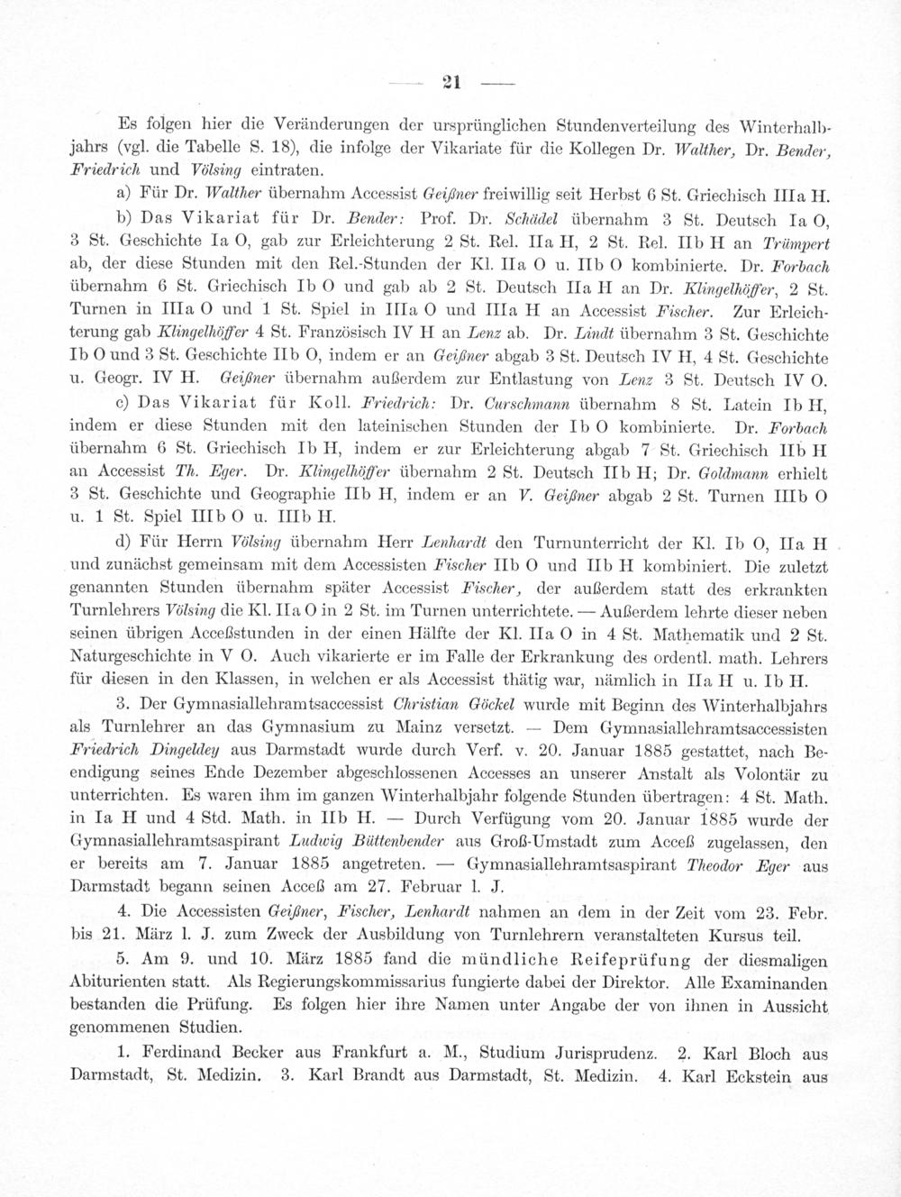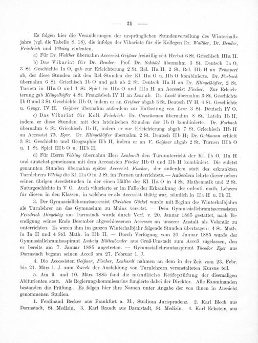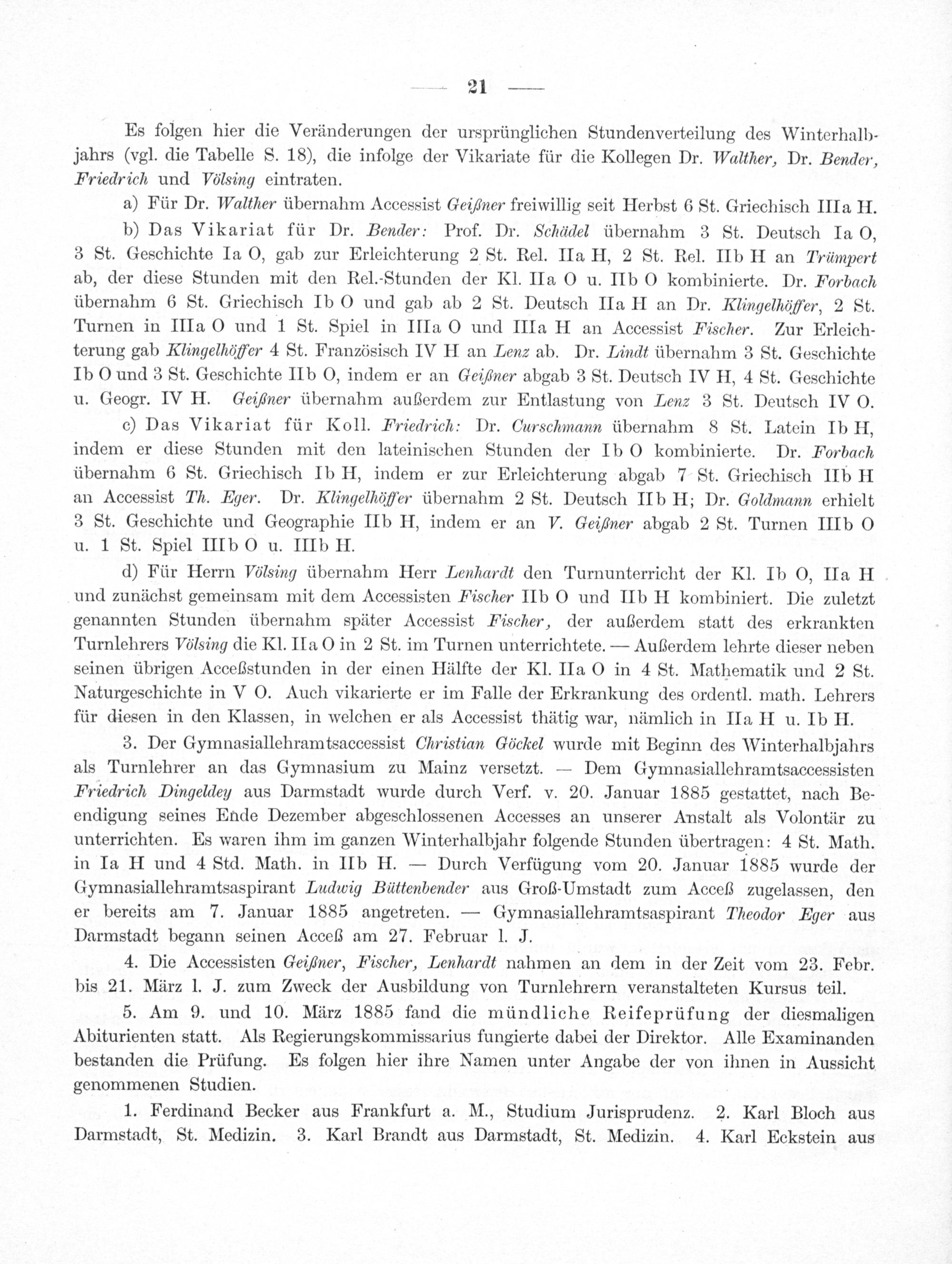 3. Der Gymnasiallehramtsaccessist Christian Göckel wurde mit Beginn des Winterhalbjahrs als Turnlehrer an das Gymnasium zu Mainz versetzt.— Dem Gymnasiallehramtsaccessisten Friedrich Dingelden aus Darmstadt wurde durch Verf. v. 20. Januar 1885 gestattet, nach Be- endigung seines Ende Dezember abgeschlossenen Accesses an unserer Anstalt als Volontär zu unterrichten. Es waren ihm im ganzen Winterhalbjahr folgende Stunden übertragen: 4 St. Math. in Ia H und 4 Std. Math. in IIb H.— Durch Verfügung vom 20. Januar 1885 wurde der Gymnasiallehramtsaspirant Ludiwig Büttenbender aus Groß-Umstadt zum Acceß zugelassen, den er bereits am 7. Januar 1885 angetreten.— Gymnasiallehramtsaspirant Theodor Eger aus Darmstadt begann seinen Acceß am 27. Februar J. J.