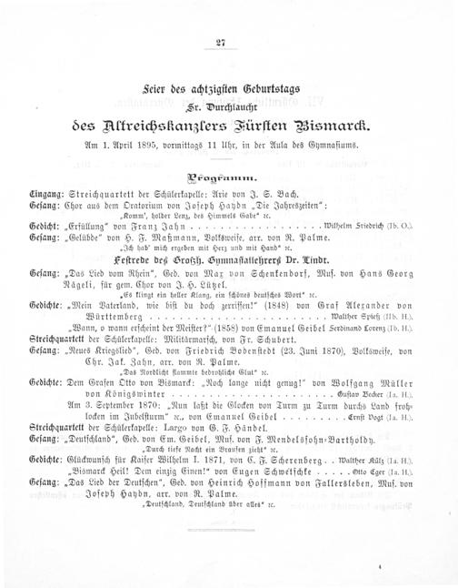 Geſang:„Das Lied vom Rhein“, Ged. von Max von Schenkendorf, Muſ. von Hans Georg Nägeli, für gem. Chor von J. H. Lützel. „Es klingt ein heller Klang, ein ſchönes deutſches Wort“ ꝛc. Gedichte:„Mein Vaterland, wie biſt du doch zerriſſen!“(1848) von Graf Alexander von Württemberr.... walther Spieß(IIb. HI.). „Wann, o wann erſcheint der Meiſter?“(1858) von Emanuel Geibel Serdinand Lorenz(Ib. H.). Streichquartett der Schülerkapelle: Militärmarſch, von Fr. Schubert. Geſang:„Neues Kriegslied“, Ged. von Friedrich Bodenſtedt(23. Juni 1870), Volksweiſe, von Chr. Jak. Zahn, arr. von R. Palme. „Das Nordlicht flammte bedrohliche Glut“ ꝛc. Gedichte: Dem Grafen Otto von Bismarck:„Noch lange nicht genug!“ von Wolfgang Müller