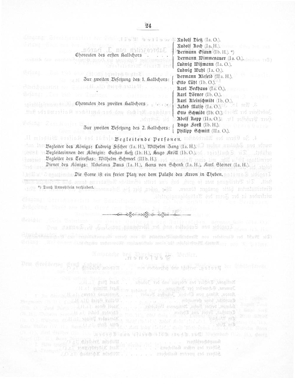 Begleiter des Teirefias: Wilhelm Schmeel(III b. H.). Diener des Königs: Nikolaus Daus(Ia. H.), KHans von Schenk(Ia. H.), Karl Steiner(la. H.).