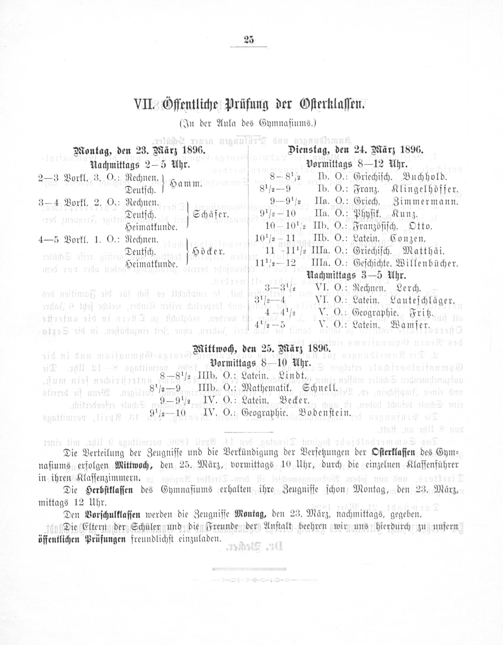Mittwoch, den 25. März 1896. Vormittags 8—10 IUlhr. 8— 8 ½ IIIb. O.: Latein. Lindt. 8 ½— 9 IIIb. O.: Mathematik. Schnell. 9— 9 ½ IV. O.: Latein. Becker. 9 ½— 10 IV. O.: Geographie. Bodenſtein.