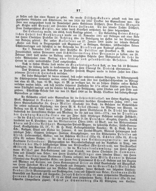 An Geſchenken erhielt unſer Gymnaſium für die Lehrerbibliothek: von Seiner Exzellenz Herrn Wirkl. Geheimrat D. Buchner: Zeitſchr. des allgemeinen deutſchen Sprachvereins Jahrg. 1907; von Herrn Gymnaſialdirektor Dr. Hugo Müller(Laubach) ſein Buch: die Gefahren der Einheitsſchule für unſere nationale Erziehung; von Herrn W. E. Nebel(Worms): die Münzen von Worms, im