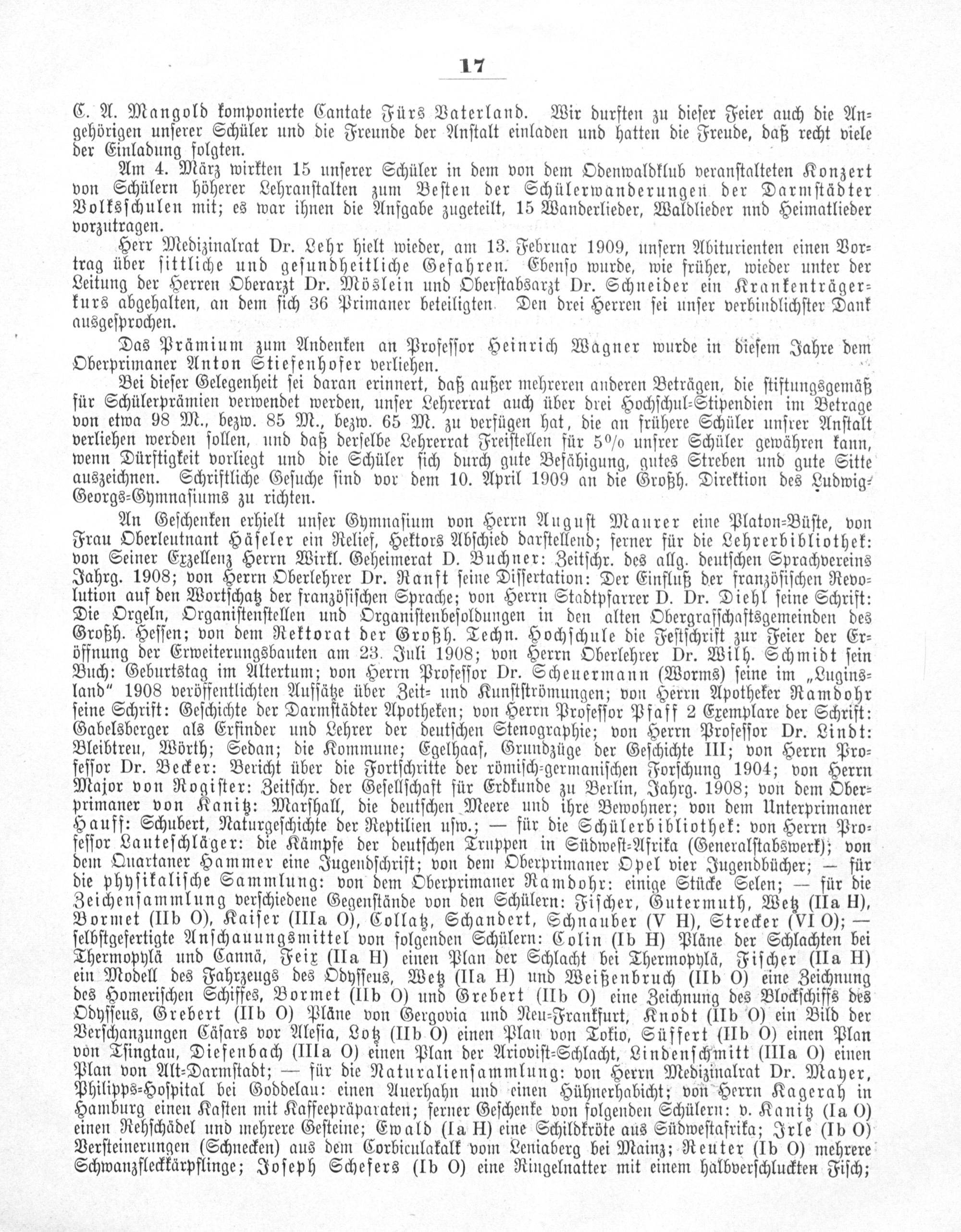 An Geſchenken erhielt unſer Gymnaſium von Herrn Auguſt Maurer eine Platon⸗Büſte, von Frau Oberleutnant Häͤſeler ein Relief, Hektors Abſchied darſtellend; ferner für die Lehrerbibliothek: von Seiner Exzellenz Herrn Wirkl. Geheimerat D. Buchner: Zeitſchr. des allg. deutſchen Sprachvereins Jahrg. 1908; von Herrn Oberlehrer Dr. Ranft ſeine Diſſertation: Der Einfluß der franzöſiſchen Revo⸗ lution auf den Wortſchatz der franzöſiſchen Sprache; von Herrn Stadtpfarrer D. Dr. Diehl ſeine Schrift: Die Orgeln, Organiſtenſtellen und Organiſtenbeſoldungen in den alten Obergrafſchaftsgemeinden des Großh. Heſſen; von dem Rektorat der Großh. Techn. Hochſchule die Feſtſchrift zur Feier der Er⸗ öffnung der Erweiterungsbauten am 23. Juli 1908; von Herrn Oberlehrer Dr. Wilh. Schmidt ſein Buch: Geburtstag im Altertum; von Herrn Profeſſor Dr. Scheuermann(Worms) ſeine im„Lugins⸗ land“ 1908 veröffentlichten Aufſätze über Zeit⸗ und Kunſtſtrömungen; von Herrn Apotheker Ramdohr ſeine Schrift: Geſchichte der Darmſtädter Apotheken; von Herrn Profeſſor Pfaff 2 Exemplare der Schrift: Gabelsberger als Erfinder und Lehrer der deutſchen Stenographie; von Herrn Profeſſor Dr. Lindt: Bleibtreu, Wörth; Sedan; die Kommune; Egelhaaf, Grundzüge der Geſchichte III; von Herrn Pro⸗ feſſor Dr. Becker: Bericht über die Fortſchritte der römiſch-germaniſchen Forſchung 1904; von Herrn Major von Rogiſter: Zeitſchr. der Geſellſchaft für Erdkunde zu Berlin, Jahrg. 1908; von dem Ober⸗ primaner von Kanitz: Marſhall, die deutſchen Meere und ihre Bewohner; von dem Unterprimaner Hauff: Schubert, Naturgeſchichte der Reptilien uſw.;— für die Schülerbibliothek: von Herrn Pro⸗ feſſor Lauteſchläger: die Kämpfe der deutſchen Truppen in Südweſt⸗Afrika(Generalſtabswerk); von dem Quartaner Hammer eine Jugendſchrift; von dem Oberprimaner Opel vier Jugendbücher;— für die phyſikaliſche Sammlung: von dem Oberprimaner Ramdohr: einige Stücke Selen;— für die Zeichenſammlung verſchiedene Gegenſtände von den Schülern: Fiſcher, Gutermuth, Wetz(IIa H), Bormet(IIb O), Kaiſer(IIIa O), Collatz, Schandert, Schnauber(V H), Strecker(VI 0);— ſelbſtgefertigte Anſchauungsmittel von folgenden Schülern: Colin(1b H) Pläne der Schlachten bei Thermopylä und Cannä, Feix(IIa H) einen Plan der Schlacht bei Thermopylä, Fiſcher(IIa H) ein Modell des Fahrzeugs des Odyſſeus, Wetz(lla H) und Weißenbruch(IIb O) eine Zeichnung des Homeriſchen Schiffes, Bormet(IIb 0) und Grebert(IIb 0) eine Zeichnung des Blockſchiffs des Odyſſeus, Grebert(IIb O) Pläne von Gergovia und Neu⸗Frankfurt, Knodt(IIb 0) ein Bild der Verſchanzungen Cäſars vor Aleſia, Lotz(IIb O) einen Plan von Tokio, Süffert(IIb O) einen Plan von Tſingtau, Diefenbach(IIIa O) einen Plan der Arioviſt⸗Schlacht, Lindenſchmitt(IIIa O) einen Plan von Alt⸗Darmſtadt;— für die Naturalienſammlung: von Herrn Medizinalrat Dr. Mayer, Philipps⸗Hoſpital bei Goddelau: einen Auerhahn und einen Hühnerhabicht; von Herrn Kagerah in Hamburg einen Kaſten mit Kaffeepräparaten; ferner Geſchenke von folgenden Schülern: v. Kanitz(1a 0) einen Rehſchädel und mehrere Geſteine; Ewald(Ia H eine Schildkröte aus Südweſtafrika; Irle(Ib 0) Verſteinerungen(Schnecken) aus dem Corbiculakalk vom Leniaberg bei Mainz; Reuter(1b 0) mehrere Schwanzfleckkärpflinge; Joſeph Schefers(Ib O) eine Ringelnatter mit einem halbverſchluckten Fiſch;