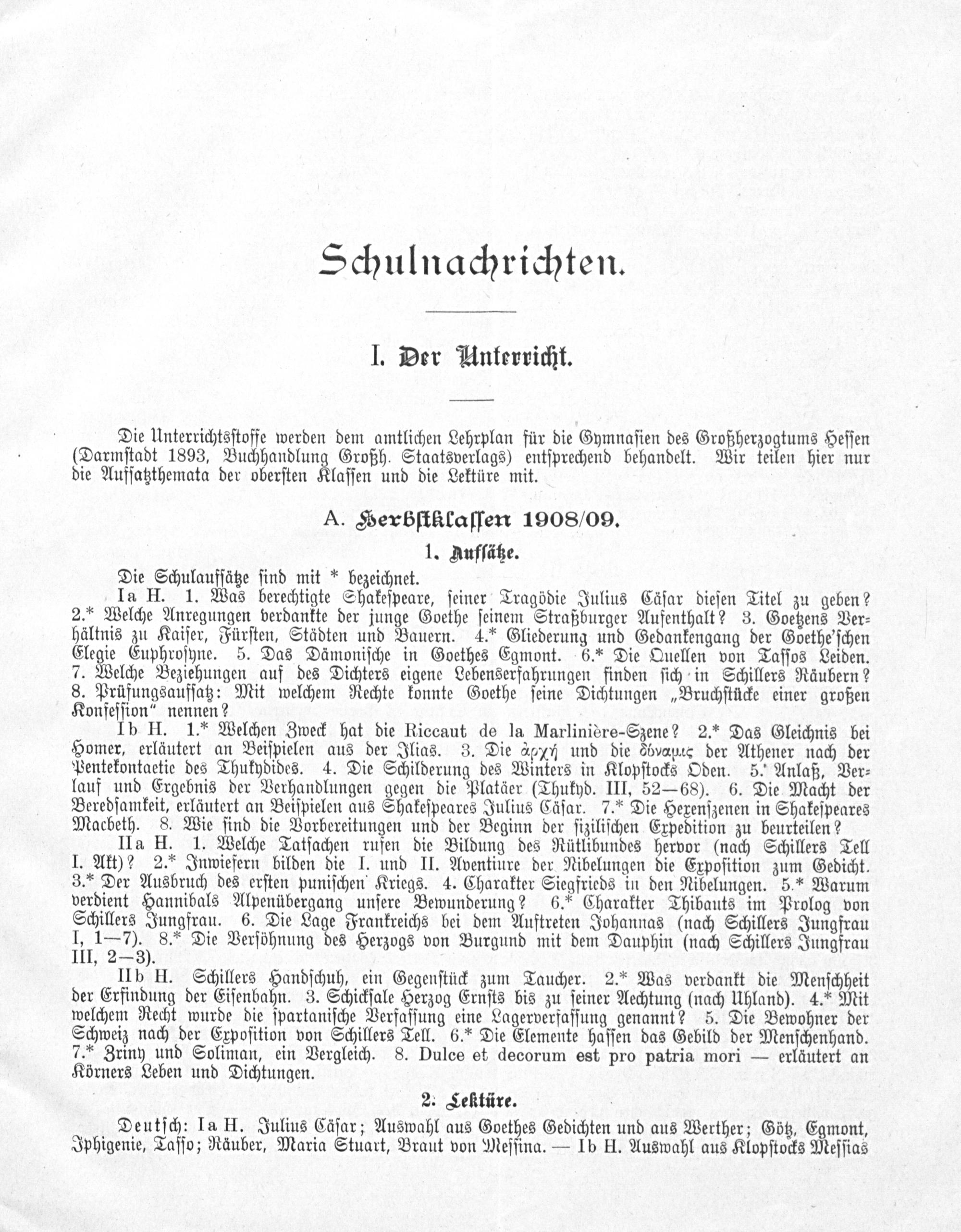 Ia H. 1. Was berechtigte Shakeſpeare, ſeiner Tragödie Julius Cäſar dieſen Titel zu geben? 2.* Welche Anregungen verdankte der junge Goethe ſeinem Straßburger Aufenthalt? 3. Goetzens Ver⸗ hältnis zu Kaiſer, Fürſten, Städten und Bauern. 4.“ Gliederung und Gedankengang der Goethe'ſchen Elegie Euphroſyne. 5. Das Dämoniſche in Goethes Egmont. 6.* Die Quellen von Taſſos Leiden. 7. Welche Beziehungen auf des Dichters eigene Lebenserfahrungen finden ſich in Schillers Räubern? 8. Prüfungsaufſatz: Mit welchem Rechte konnte Goethe ſeine Dichtungen„Bruchſtücke einer großen Konfeſſion“ nennen?