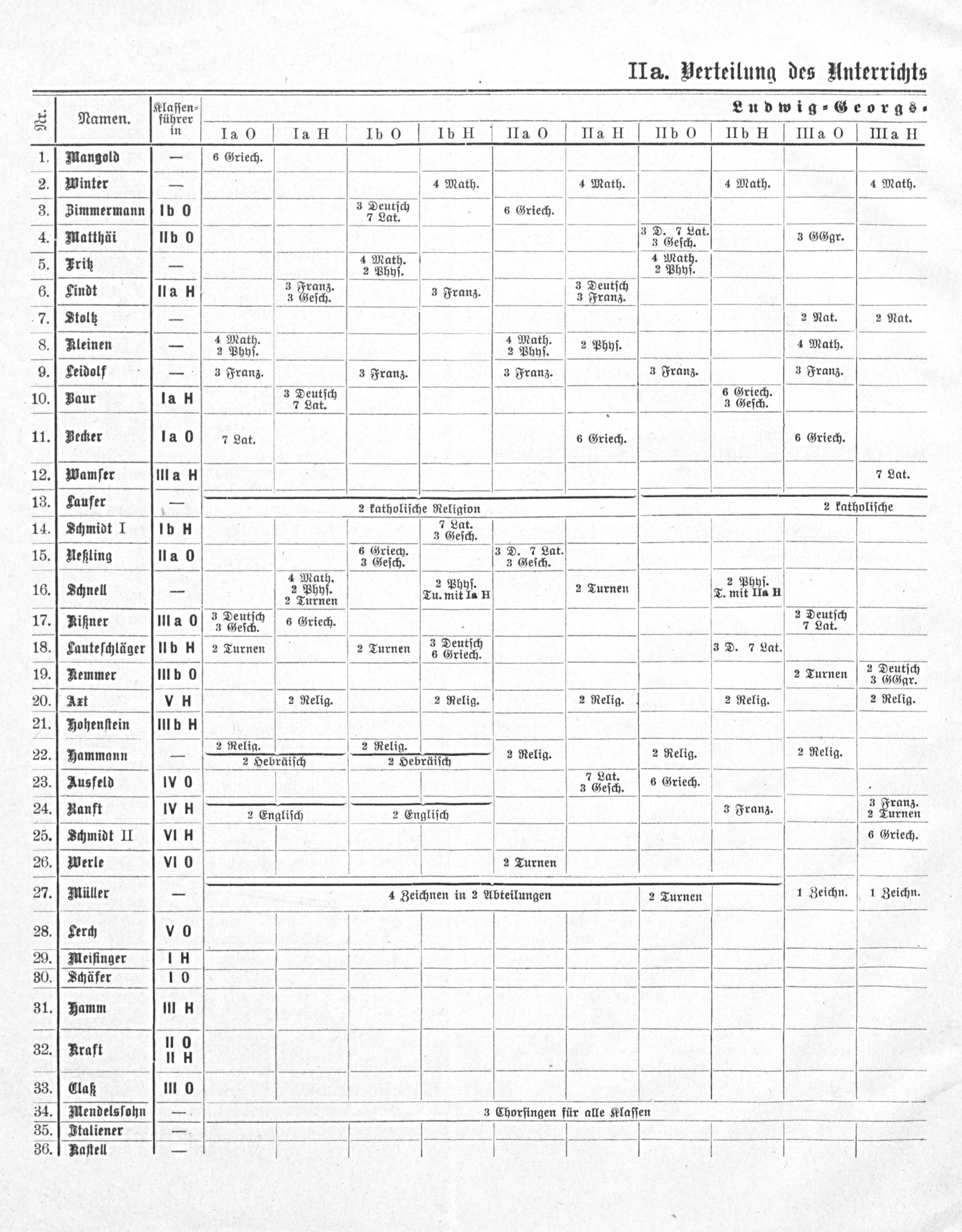 Klaſſen⸗ Ludwig⸗G eor g 3⸗ Namen. fführer in IaO Ia H 1 1b o 16 H 1Ia O Ila H Ilb o IIb H IIIa O IHIa H Mangold—-— 6 Griech. Winter—. 4 4 Math. 4 Math. 4 Math. 4 Math. Zimmermann 1b 0 2 Deutfſch 6 Griech. mMatthäi l1b 0 5 Daahet 3 GGgr. —(1 Math. 4 Math.— Frit—* Math. V ch Lindt Ila H 3 Tran. a Franz. 3 Deuiſch 7. Stoltz— 2 Nat. 2 Nat. R 4 Math. 5 4 Math. 2 Bleinen— 9 e neuſ. 1 4 Math. Leidolf 3—-— 3 Franz. 3 Franz. 3 Franz. 3 Franz. 3 Franz. Baur la H 4 Peutfeh 4 Griech. Becher la 0 7 at. 6 Griech. 6 Griech. Wamſer lIl a H— 7 Lat. Laufer 1— 2 katholiſche Religion 2 katholiſche 7Lat. Schmidt I ſ1b RH I riih efuns uao Te4 4 Mat. 6 2 Phyſ. 2² Phyſ. Schnell— 1ohh. Ti MM n 2 Turnen T. mit IIa H Rißner lIla O ³ Teutſch a Griech.. 2 aneſ Lauteſchläger lIb H 2 Turnen 2 Turnen 3 Deutſch 3 D. 7 Lat. — V 1anen es . Axt VH 2 Relig. 2 Relig. 2² Relig. 2 Relig. 2 Relig. hohenſtein Illb H .. 2 Relig. 22 Relig... Y Hammann— 2 Hebralſch ISebraälſch 2 Relig. 2 Relig. 2 Relig. Ausfeld IV O 37Geath. 6 Griech.— 1 35. Ranft IV H 2 Engliſch Engliſch—— 2 Jranz. 3 Turne Schmidt II VIH 6 Griech. Werle VIO 2 Turnen Müller—. 4 Zeichnen in 2 Abteilungen 2 Turnen 1 Zeichn. 1 Zeichn. Lerch VO 9. Meifinger 1H Schäfer 1 0— Hamm IIl H 11 0 Rraft nn Claß 11l 0 34.] Mendelsfohn— 3 Chorſingen für alle Klaſſen Italiener— Raſtell—