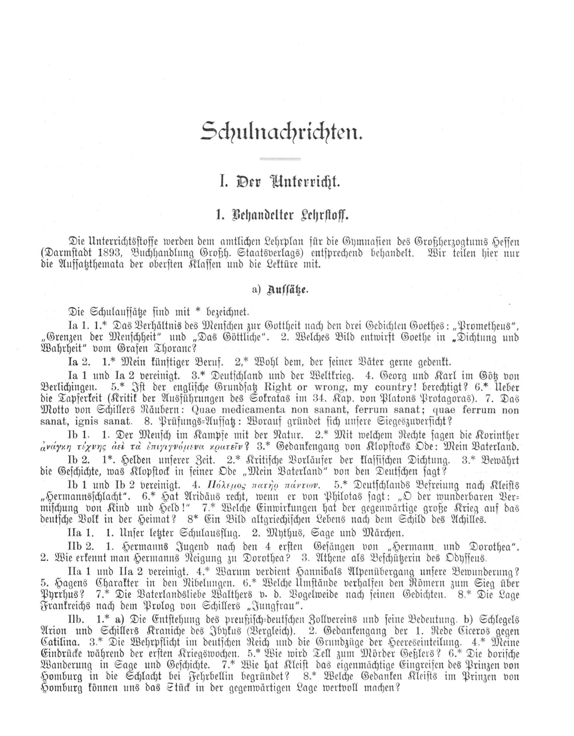 Die Unterrichtsſtoffe werden dem amtlichen Lehrplan für die Gymnaſien des Großherzogtums Heſſen (Darmſtadt 1893, Buchhandlung Großh. Staatsverlags) entſprechend behandelt. Wir teilen hier nur die Aufſatzthemata der oberſten Klaſſen und die Lektüre mit.
