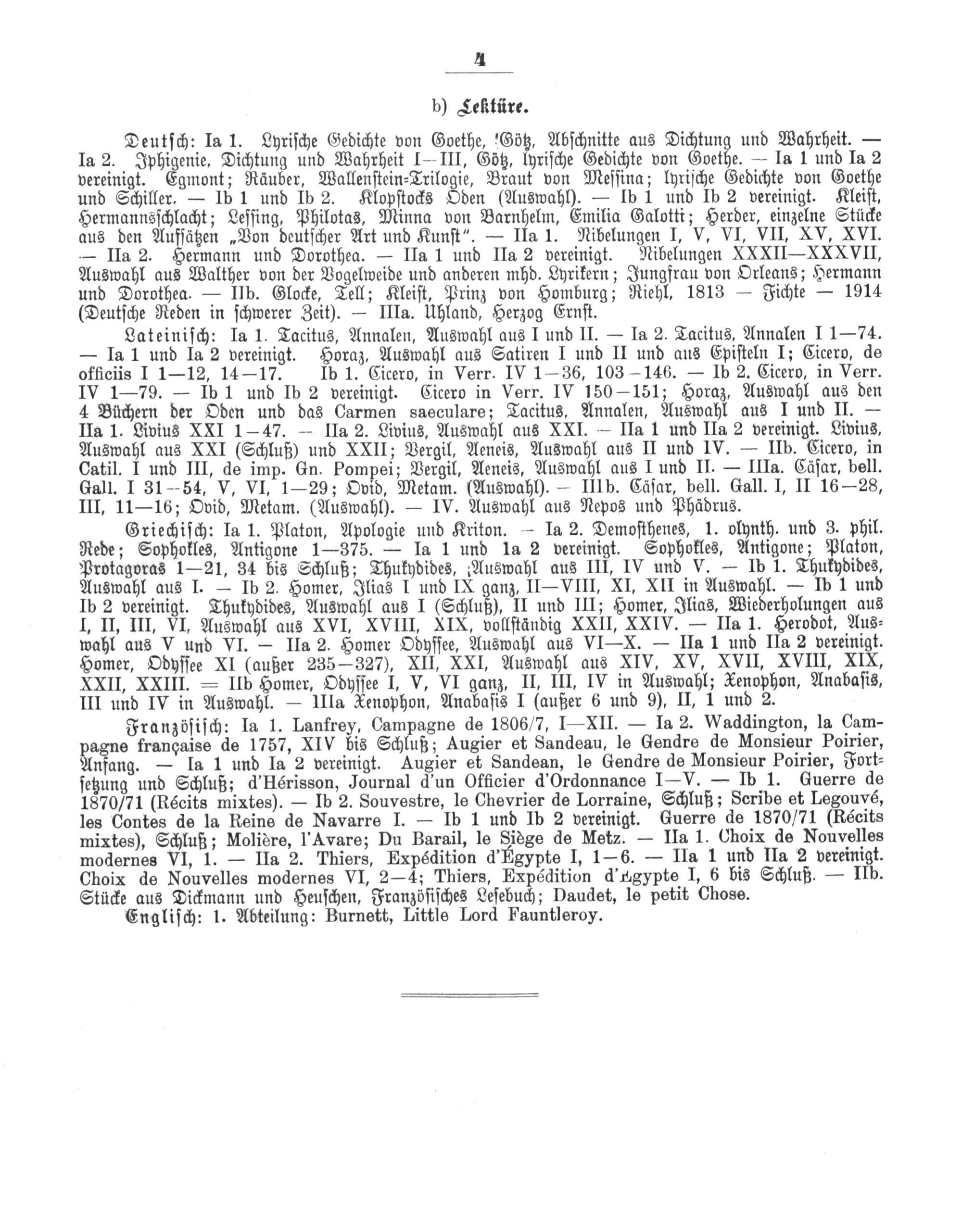 Deutſch: Ia 1. Lyriſche Gedichte von Goethe, Götz, Abſchnitte aus Dichtung und Wahrheit.— Ia 2. Iphigenie, Dichtung und Wahrheit I-— III, Götz, lyriſche Gedichte von Goethe.— la l und Ia 2 vereinigt. Egmont; Räuber, Wallenſtein⸗Trilogie, Braut von Meſſina; lyriſche Gedichte von Goethe und Schiller.— Ib 1 und Ib 2. Klopſtocks Oden(Auswahh).— 1b 1 und 1b 2 vereinigt. Kleiſt, Hermannsſchlacht; Leſſing, Philotas, Minna von Barnhelm, Emilia Galotti; Herder, einzelne Stücke aus den Aufſätzen„Von deutſcher Art und Kunſt“.— IIa 1. Nibelungen I, V, VI, VII, XV, XVI. — IIa 2. Hermann und Dorothea.— IIa 1 und IIa 2 vereinigt. Nibelungen XXXII—XXXVII, Auswahl aus Walther von der Vogelweide und anderen mhd. Lyrikern; Jungfrau von Orleans; Hermann und Dorothea.— IIb. Glocke, Tell; Kleiſt, Prinz von Homburg; Riehl, 1813— Fichte— 1914 (Deutſche Reden in ſchwerer Zeit).— IIIa. Uhland, Herzog Ernſt.