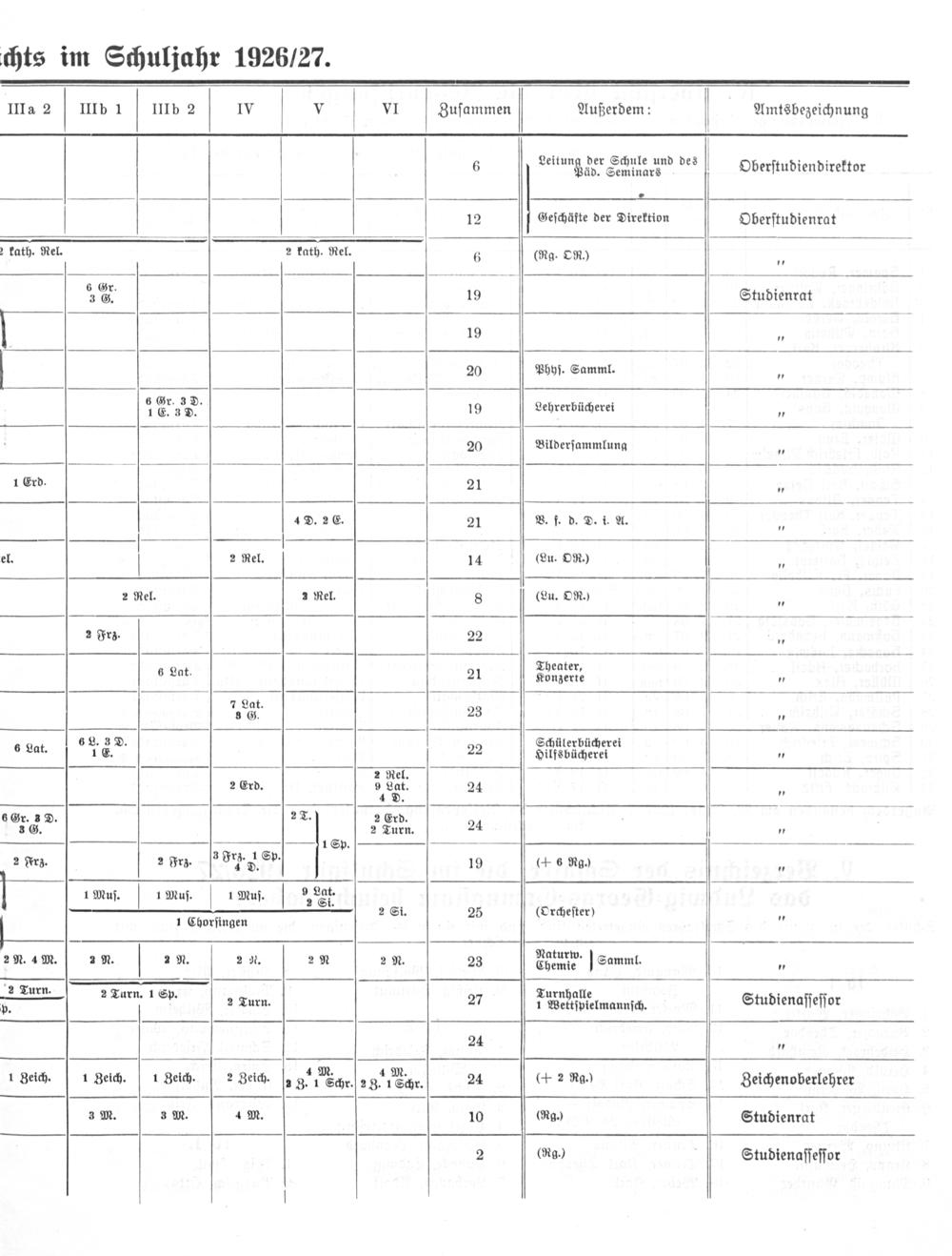 IIIa 2 IIIb 1 IIIb 2 IV V VI Zuſammen Außerdem: Amtsbezeichnung 6 Leitun der Schyle und des Oberſtudiendirektor 2. 12 Geſchäfte der Direktion Oberſtudienrat 2 kath. Rel. 2² kath. Rel. 6(Rg. OR.) 77 8, r. 19 Studienrat 19„ 20 Phyſ. Samml. 4 4 gr 3d 19 Lehrerbücherei„ 20 Bilderſammlung 4 1 Erd. 21„„ 4 D. 2 E. 21 B. f. d. D. i. A. 17 el. 2 Rel. 14(Lu. OR.)„ 2 Rel. 2 Rel. 8(Lu. OR.)„ 2 Frz. 22„ Theater, 6 Lat. 21 Konzerte„ 7 Lat. 3 G. 23„ 6 L. 3 D. Schülerbücherei 6 Lat. 1 22 Hilfsbücheret„ 2² Rel. 2 Erd. 9 Lat. 24 4 D. 2— 6 Gr. 3 D. 2 T. 2 Erd. 3 G. 2 Vdn. 24„ 1 Sp. 12 8es 2 Srz. ¹9Jr. 1 Sp. 19( 6 Rg.)„ ¹ Muſ. 1 Muſ. 1 Muſ. 9, Loe. 2 2 Si. Orcheſt 1 Chorſingen 25(Lrcheſen 6 2 R. 4M. 2 N. 2 R. 2 R. 2 R 2 R. 23 Taturw. Sammt.„ 2 Turn. S p. 2 Tarn. 1 Sp. 2² Turn. 27 Tnhale maunſch. Studienaſſeſſor 24„ 4 M. 4 M. 1 Zeich. 1 Zeich. 1 Zeich. 2 Zeich. 2 3. 1 Schr. 23.1 Schr. 24(+ 2 Rg.) Zeichenoberlehrer 3 M. 3 M. 4 M. 10(Rg.) Studienrat 2(Rg.) Studienaſſeſſor