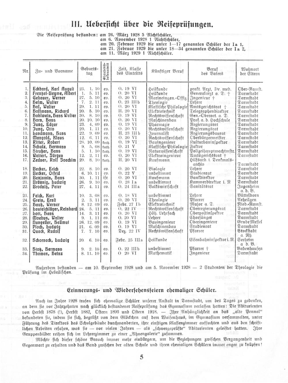 4 ☛ Geburts⸗ 5 8Zeit, Klaſſe Beru Wohnort 2 L„ d 9 ohnor Nr.] Zu⸗ und Vorname tag 3 des Eintritts Künftiger Beruf des Vufrs der Eltern 5 1. Eckbard, Karl fluguſt 23. 1. 10 ev. 0. 19 VI Heilkunde prakt. Arzt, Dr. med. Ober⸗Raniſt. 2. Frentzel-Beume, flIbert 1. 5. 11 ev. 0. 20 VI Heilkunde Generalarzt a. D. †(Darmſtadt 3. Gebauer, Werner 27. 5. 10 ep. 0. 20 VI Marineingen.⸗Offiz.] Ingenieur † Darmſtadt 4. Pelm, Walter 7. 2. 11 ev. O. 23 IIIb Theologie Lehrer Darmſtadt 5. Pof, Walter 29. 1. 11 Pev. 0. 20 VI Klaſſiſche Philologie Amtsgerichtsrat † Darmſtadt 6. Foffmann, Richard 20. 5. 10 ev. II. 20 VI Elektrotechnik Telegraphendirektor Darmſtadt 7. Fohlwein, Pans Walter 30. 8. 10 ev. 0. 19 VI Rechtswiſſenſchaft Gen.⸗Obervet. a. D. Darmſtadt 8.] Porn, ans 20. 10. 10 ev. 0. 20 VI Maſchinenbau Prof. a. d. Hochſchule(Darmſtadt 9. Zung, Edgar 23. 4. 09 ev. 0. 19 VI Pharmazie Regierungsrat Darmſtadt 10. Bun. Otto 20. 1. 11 Pev. 0. 20 VI Rectswiſſenſchaft Regierungsrat Darmſtadt 11. handmann, Hans 22. 9. 09 ev. II. 23 IIIb Journaliſt Regierungsbaurat Darmſtadt 12. TTlangold, Klaus 12. 6. 11 ev. 0. 20 VI Rechtswiſſenſchaft Oberbürgermeiſter Darmſtadt 13. Ritter, Robert 28. 10. 09 ſrath 0. 19 VI Bauingenieur Kulturbauinſpektor Darmſtadt 14. Schulz, Permann 9. 5. 08 ſrath.] O. 21 V Klaſſiſche Philologie Faktor Darmſtadt 15. Straßer, Pans 5. 1. 10 ſrath.] O. 19 VI. Naturwiſſenſchaft Polizeihauptwachtmſtr. Darmſtadt 16. Weitert, hügen 12. 2. 11 ev. 0. 20 VI Elektroingenieur Amtsgerichtsrat † Darmſtadt 17.] Zedner, Rolf Joachim 29. 8. 10 ſtath.] II. 20 VI. Kaufmann Hilfsarb. i. Denkmals⸗ archiv Darmſtadt 18. Becker, Erich 22. 8. 10 ev. 0. 20 VI. Biologie Lehrer Darmſtadt 19. Becker, Oifrid 6. 10. 11 ev. 0. 22 V unbeſtimmt Studienrat Darmſtadt 20. Benjamin, Pans 30. 1. 11 iſr 0. 20 VI. Kaufmann Bankdirektor Darmſtadt 21. Bräunig, hudwig 26. 9. 10 Pev. 0. 28 Ia unbeſtimmt Kammerdirektor i. R Darmſtadt 22. Brodniß, Peter 27. 4. 11 ev. 0. 24 IIIa Volkswirtſchaft Sanitätsrat Iugenheim a. d. B. 23. Feick, Kurt 10. 3. 08 ev. 0. 18 VI unbeſtimmt Lehrer Büttelborn 24. Grein, Ernſt 2. 3. 11 ev. 0. 20 VI Theologie Pfarrer Arheilgen 25. Pauß, Werner 8. 12. 09 ev. Febr. 27 Ib(Elektrotechnik Major a. D. Nied.⸗Ramſt. 26. bauteſchläger, Reinhard 24. 5. 11 ev. O. 22 IV Rechtswiſſenſchaft Oberregierungsrat Darmſtadt 27. hott, Pans 14. 3. 11 Pev. 0. 20 VI. Höh. Lehrfach Oberpoſtinſpektor Darmſtadt 28. Moebus, Walter 9. 1. 11 ev. 0. 20 VI Lehrer Chorſänger Darmſtadt 29. Hungeller, Hellmut 26. 12. 09 Pev. 0. 19 VI Bauingenieur Oberingenieur Grube Meſſel 30. Ploch, hudwi 21. 6. 09 ev. 0. 19 VI Maſchinenbau Studienrat Darmſtadt 31.] Quack, Rudol 7. 7. 10 Pev. Dez. 22 IV Rechtswiſſenſchaft(Pfarrer Stosſtadt a. Rh 32.] Schornack, hudwig 20. 6. 10 ev.] Febr. 25 IIIa(Heilkunde Eiſenbahninſpektori. R. Seeheim a d. B. 33. Stotz, ermann 9. 2. 10%ſev. 0. 22 IIIb ſunbeſtimmt Pfarrer f Babenhauſen 34.] Thomas, Heinz 8. 11. 10 ev. 0 20 VI Mathematik Ingenieur Darmſtadt