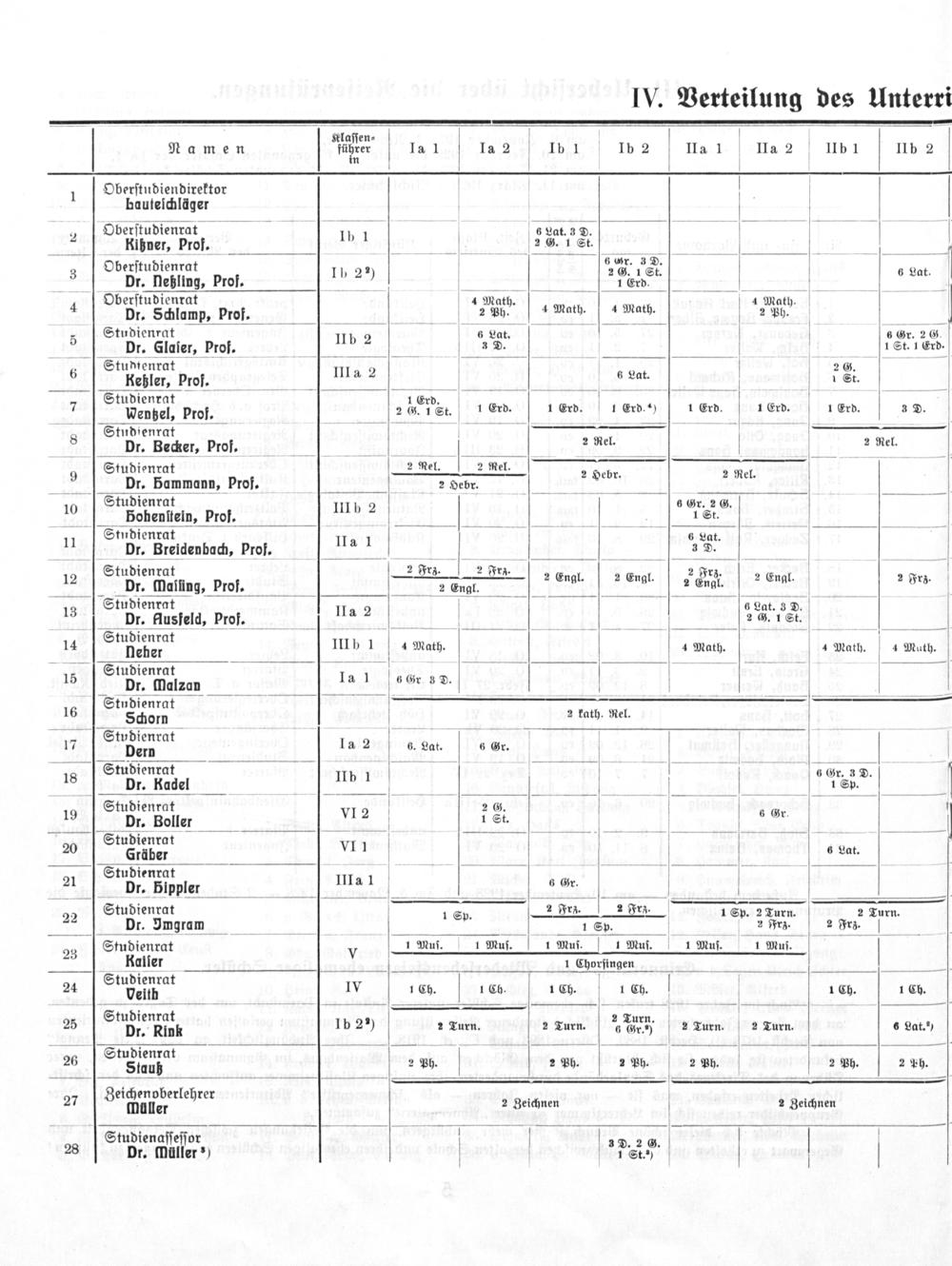 Namen führer 1a 1 Ia 2 V Ib 1 Ib 2 Hla 1 Ila 2 Ib 1 IIb 2 1 Oberſtudiendirektor hauteſchläger „ Oberſtudienreatkatf 6 Lat. 3 D. 2kKitnet, Pro. 4* 2 G, 1 Oberſtudienrat 32— Gr. 3 D.—* 3 Ppr. Nehling, Prof. 1) 2*) 23e nt. a Lat. Oberſtudienrat 4 Math a Math. 3 Dr. Schlamp, Prof. 2 7h. 4 Math. 4 Math. 2 b. Studienrat. nehnIb 2“ 6 Lat.. e 7 Gr. 2 G7 3 Pr. Slaler, Prof.— IIb 2 3 8 1'St. 1 Erd. Stußtenrat 5 2 G.— 6 Kehler, Prof.— IIIa 2 6 Lat. 8 G. Studienrat 154——— 7 Wentzel, prof. 2 G. 1Et. 1¹Erd 1 Erd. ¹ Erd.*) 1 Erd 1 Erd. 1 Erd 3 D. 8 Studſenrat——. 2 Pr. Becker, Prof.— 11 2 Rel. 2 Rel. Studienrat 2 Rel. 2 Rel.—* 9 Dr. Pammann, prof. 7 vedr. 2 Hebr. 2 Rel. Studienrat 6— 6 Gr. 2 G O— ¹10 FPohenſtein, Prof. 111 b 2„St. Studienrat 1Shs lr 6 Lat“ 11 Dr. Breidenbach, prof. l2I 4 3 Studienrat 2 Frz 2 Frz. 2 Frz. e Fe 12 8 Dr. Walfng, Prof.— 2 Snal. 2² Engl. 2 Engl. 2 Cnal 2 Engl. 2 Frz. Studienrat—E de 13 Pr. Kusfeld, Prof. 112 V 2Rt.u. Studienrat————(— 14 ieher IIIb 1 4 Math. 4 Math 4 Math. 4 Math. Süundienrat kkA-—.— 15 Dr. ſalzan— 1211 162 12. Studienrat=—— 16 Schorn 2 kath. Rel. 1 Studienrat— 1 Dern Ia 2 6. Lat. 6 Gr. Studienrat ei.- 6 Gr. 3 D. 18 Dr. Kadel n V 76re. Studienrat— 7 G.————+ 19 Pr. Boller 12 1 St. V 6 Gr. V Studienrat ͤ———— 20 Gräber VII V 6 Lat. — Studienrat 8——— 42¹ Dr. Blppler Ilal Gr. V Studienrat—— 235— 24 1 Sp. 1 Sp. 2 Turn. 2 Turn. 2 Dr. Imgram er 1 1 Sp. 4 2 Srz. ² Frz 23 Studienrat v 1 Muſ. 1 Muſ. 1 Muſ. 1 Muſ. 1 Muſ. ul Muſ. 8 Kalier 1 Chorſingen tudienrat——— 24 veith IV 1 Ch. 1 Ch. 1 G. 1 G9. V ¹ Ch. 1 Ch. Studienrat— ʒ— 25 Dr. Rink 1b 2*) ² Turn. 2 Turn ² Wurn. 2² TXurn. V 2 Turn. 6 Lat.) 26 Studienrat öͤͤ 4 5 Stauh 2 Ph. 2 Ph. 2 Ph. 2 Ph. 2 Ph. 2 Ph ————— ¹—xxx;O——·‿‿2 Zeichenoberlehrer 27 Wüller 4 2 Zeichnen 2 Zeichnen Studienaſſeſſor V 28 Dr. Mlüller“) V 2ai V Y V