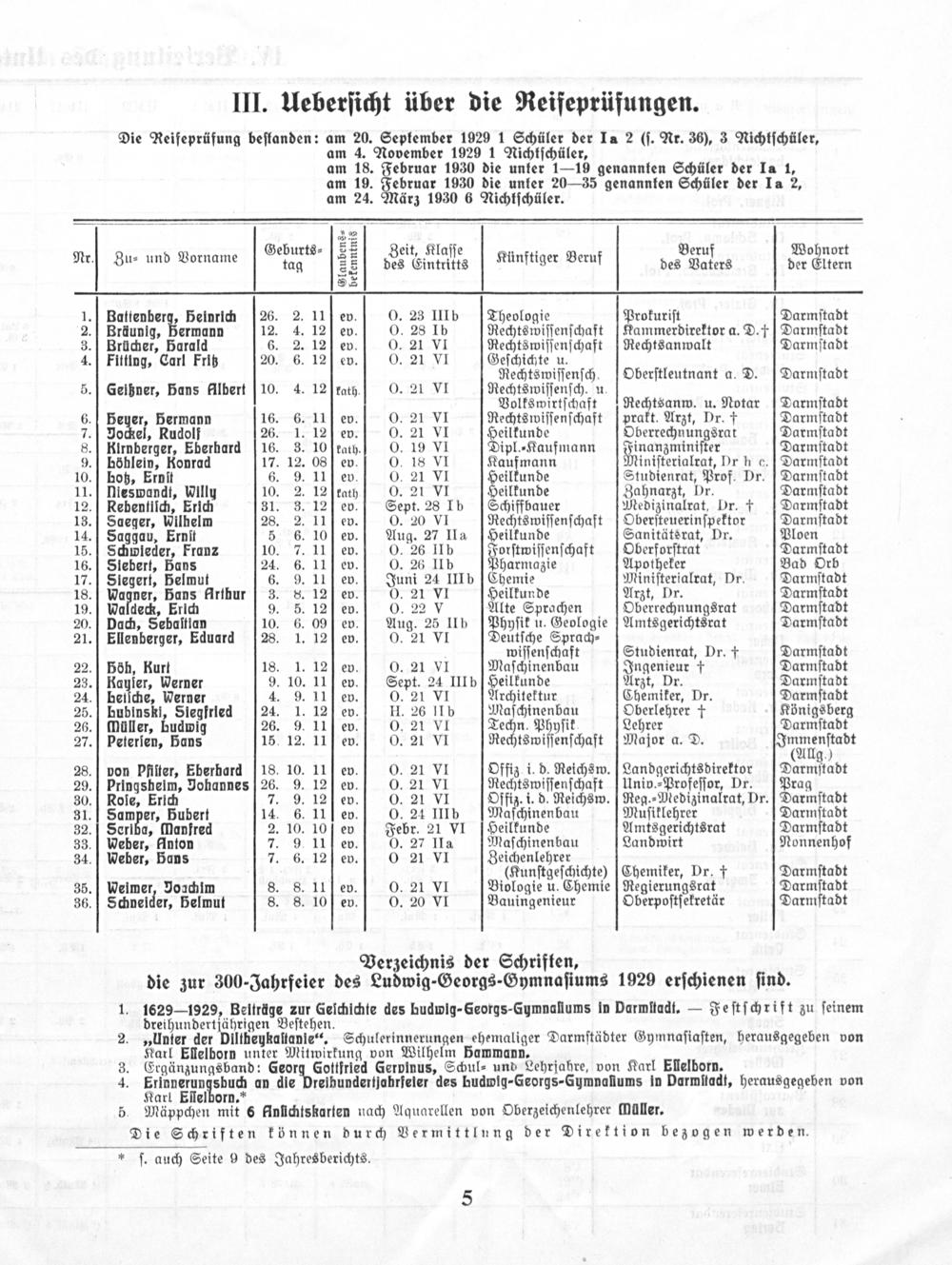 Geburts⸗ 8 Zeit, Klaſſe. Beru Wohnort Nr. Zu⸗ und Porname tag[ des Eintritts Künftiger Beruf des Vafers der Eltern 5ᷣ 1. Battenberg Peinrich[26. 2. 11 ev. O. 23 IIIb(Theologie Prokuriſt Darmſtadt 2. Bräunig, Permann 12. 4. 12 ev. 0. 28 Ib Rechtswiſſenſchaft Kammerdirektor a. D. †Darmſtadt 3. Brücher, Harald 6. 2. 12 ev. O. 21 VI Rechtswiſſenſchaft(Rechtsanwalt Darmſtadt 4. Fitting, Carl Fritz 20. 6. 12 ev. O. 21 VI Geſchichte u. Rechtswiſſenſch. Oberſtleutnant a. D.(Darmſtadt 5. Geihner, Pans flbert10. 4. 12 ſPrath.] O. 21 VI. Rechtswiſſenſch. u. Volkswirtſchaft Rechtsanw. u. Notar Darmſtadt 6. Heuer, Permann 16. 6. 11 ev. 0. 21 VI Rechtswiſſenſchaft prakt. Arzt, Dr. † Darmſtadt 7. Jockel, Rudolf 26. 1. 12 Pev. O. 21 VI Heilkunde Oberrechnungsrat Darmſtadt 8. Kirnberger, Eberhard 16. 3. 10 ſtath.] O. 19 VI Dipl.⸗Kaufmann Finanzminiſter Darmſtadt 9. höhlein, Konrad 17. 12. 08 ev. 0. 18 VI Kaufmann Miniſterialrat, Dr h c. Darmſtadt 10. hotz, Ernſt 6. 9. 11 ev. O. 21 VI. Heilkunde Studienrat, Prof. Dr. Darmſtadt 11. nieswandt, Willu 10. 2. 12 ſeath 0. 21 VI Heilkunde Zahnarzt, Dr. Darmſtadt 12. Rebentiſch, Erich 31. 3. 12 ev.!] Sept. 28 Ib(Schiffbauer Medizinalrat, Dr. †(Darmſtadt 13. Saeger, Wilhelm 28. 2. 11 ev. 0. 20 VI Rechtswiſſenſchaft Oberſteuerinſpektor Darmſtadt 14. Saggau, Ernſt 5 6. 10 ſev. Aug. 27 IIa(Heilkunde Sanitätsrat, Dr. Ploen 15. Schwieder, Fraunz 10. 7. 11 ev. 0. 26 IIb Forſtwiſſenſchaft Oberforſtrat Darmſtadt 16. Siebert, ans 24. 6. 11 Pev. O. 26 IIb harmazie Apotheker Bad Orb 17. Siegert, elmut 6. 9. 11 epv.ü Juni 24 IIIb(Chemie Miniſterialrat, Dr. Darmſtadt 18. Wagner, Pans fIrthur 3. S. 12 ſev. O. 21 VI. Heilkunde Arzt, Dr. Darmſtadt 19. Waldeck, Erich 9. 5. 12ev. 0. 22 V Alte Sprachen Oberrechnungsrat Darmſtadt 20. Dach, Sebaſtian 10. 6. 09 ev. Aug. 25 IIb[Phyſik u. Geologie Amtsgerichtsrat Darmſtadt 21. Ellenberger, Eduard 28. 1. 12]ev. O. 21 VI Deutſche Sprach⸗ wiſſenſchaft Studienrat, Dr. † Darmſtadt 22. öh, Kurt 18. 1. 12 ev. 0. 21 VI Maſchinenbau Ingenieur † Darmſtadt 23. Kauler, Werner 9. 10. 11 ev. Sept. 24 IIIb Heilkunde Arzt, Dr. Darmſtadt 24. bellche, Werner 4. 9. 11 ev. 0. 21 VI Architektur Chemiker, Dr. Darmſtadt 25. hubinski, Siegfried 24. 1. 12 ev. IHI. 26 IIb Maſchinenbau Oberlehrer † Königsberg 26. Wüller, hudwig 26. 9. 11 ev. O. 21 VI Techn. Phyſik Lehrer Darmſtadt 27. Peterien, ans 15. 12. 11 ev. 0. 21 VI Rechtswiſſenſchaft Major a. D. Frünenſtadt (Allg.) 28. pon Pfiſter, Eberhard 18. 10. 11 ev. O. 21 VI Offiz i. d. Reichsw. Landgerichtsdirektor(Darmſtadt 29. Pringsheim, Johannes 26. 9. 12 ev. 0. 21 VI Rechtswiſſenſchaft(Univ.⸗Profeſſor, Dr.(Prag 30. Role, Erich 7. 9. 12 ev. 0. 21 VI Offiz. i. d. Reichsw. Reg.⸗Medizinalrat, Dr. Darmſtadt 31.]— Samper, Hubert 14. 6. 11 ev. 0. 24 IIIb Maſchinenbau Muſiklehrer Darmſtadt 32.] Scriba, ſlanfred 2. 10. 10 en Febr. 21 VI Heilkunde Amtsgerichtsrat Darmſtadt 33. Weber, Hnton 7. 9. 11 ev. O. 27 IIa Maſchinenbau Landwirt Nonnenhof 34. Weber, Pans 7. 6. 12 ev. 0 21 VI Zeichenlehrer (Kunſtgeſchichte)(Chemiker, Dr. † Darmſtadt 35.] Weimer, Joachim 8. 8. 11 ev. 0. 21 VI Biologie u. Chemie Regierungsrat Darmſtadt 36. Schveider, Helmut 8. 8. 10] ſev. 0. 20 VI Bauingenieur Oberpoſtſekretär Darmſtadt