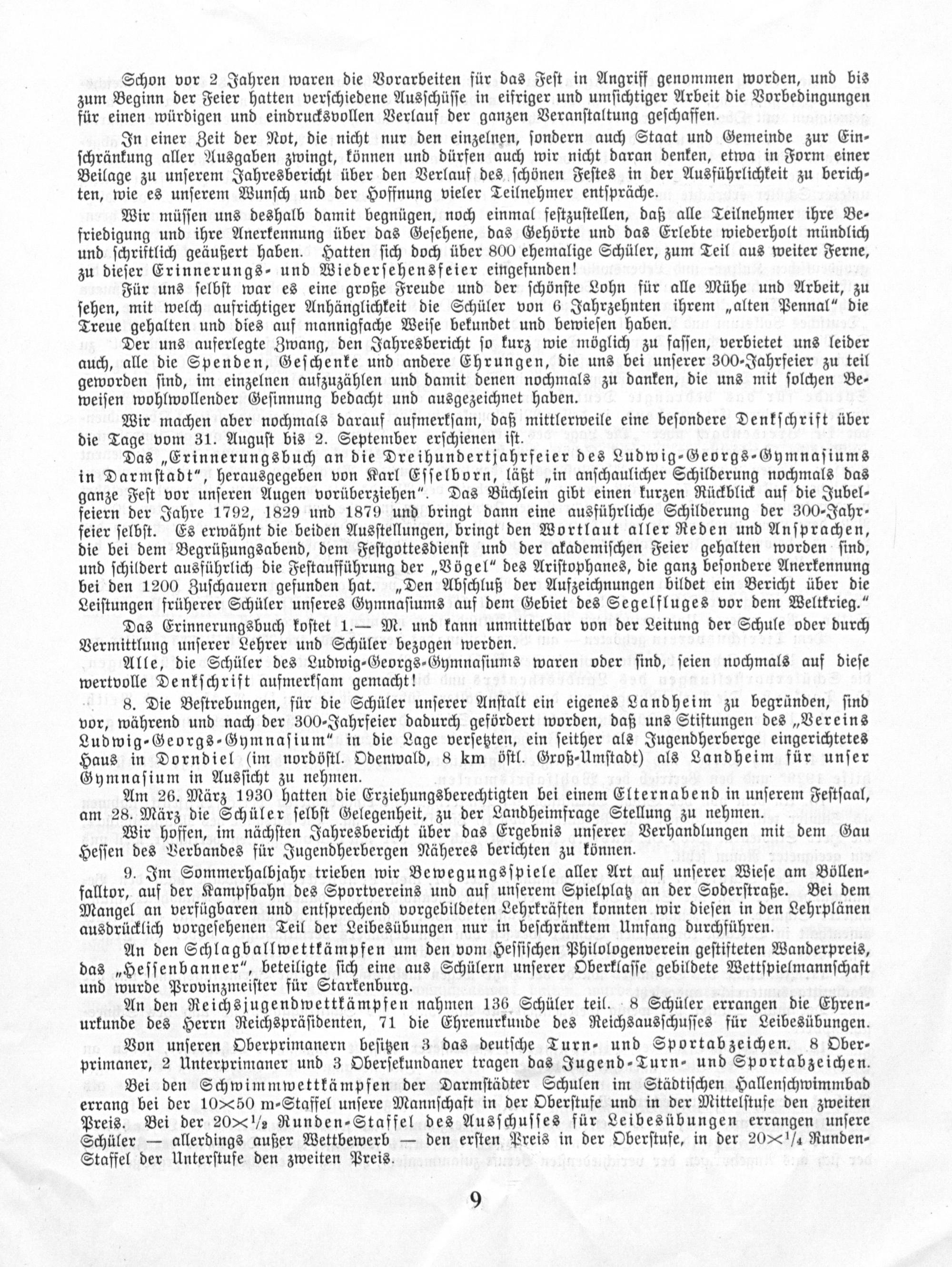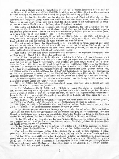 Das„Erinnerungsbuch an die Dreihundertjahrfeier des Ludwig⸗Georgs⸗Gymnaſiums in Darmſtadt“, herausgegeben von Karl Eſſelborn, läßt„in anſchaulicher Schilderung nochmals das ganze Feſt vor unſeren Augen vorüberziehen“. Das Büchlein gibt einen kurzen Rückblick auf die Jubel⸗ feiern der Jahre 1792, 1829 und 1879 und bringt dann eine ausführliche Schilderung der 300⸗Jahr⸗ feier ſelbſt. Es erwähnt die beiden Ausſtellungen, bringt den Wortlaut aller Reden und Anſprachen, die bei dem Begrüßungsabend, dem Feſtgottesdienſt und der akademiſchen Feier gehalten worden ſind, und ſchildert ausführlich die Feſtaufführung der„Vögel“ des Ariſtophanes, die ganz beſondere Anerkennung bei den 1200 Zuſchauern gefunden hat.„Den Abſchluß der Aufzeichnungen bildet ein Bericht über die Leiſtungen früherer Schüler unſeres Gymnaſiums auf dem Gebiet des Segelfluges vor dem Weltkrieg.“