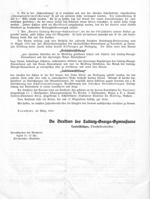 „Gedächtnisſtiftung“ „zum ehrenden Gedenken der im Weltkrieg gefallenen Lehrer und Schüler des Ludwig⸗Georgs⸗ Gymnaſiums und des ehemaligen Neuen Gymnaſiums“ dazu dienen, bedürftigen Schülern, insbeſondere Kindern von ehemaligen Angehörigen des Ludwig⸗Georgs⸗ Gymnaſiums und des Neuen Gymnaſiums und von im Weltkrieg Gefallenen, den Beſuch des Ludwig⸗ Georgs⸗Gymnaſiums zu ermöglichen oder zu erleichtern, und unter dem Namen „Jubiläumsſtiftung“ den Zwecken der Schule in der Art dienen, daß dieſer Mittel zur Verfügung geſtellt werden, die von anderer Seite nicht oder nicht in ausreichendem Maße beſchafft werden können. Gedacht iſt hierbei ins⸗ beſondere an Einrichtungen und Veranſtaltungen, die möglichſt vielen Schülern zugute kommen, wie z. B. Erleichterung von Schülerwanderungen, Verſchönerung von feſtlichen Veranſtaltungen, Ermög⸗ lichung des Aufenthalts in einem Landheim und dergl.