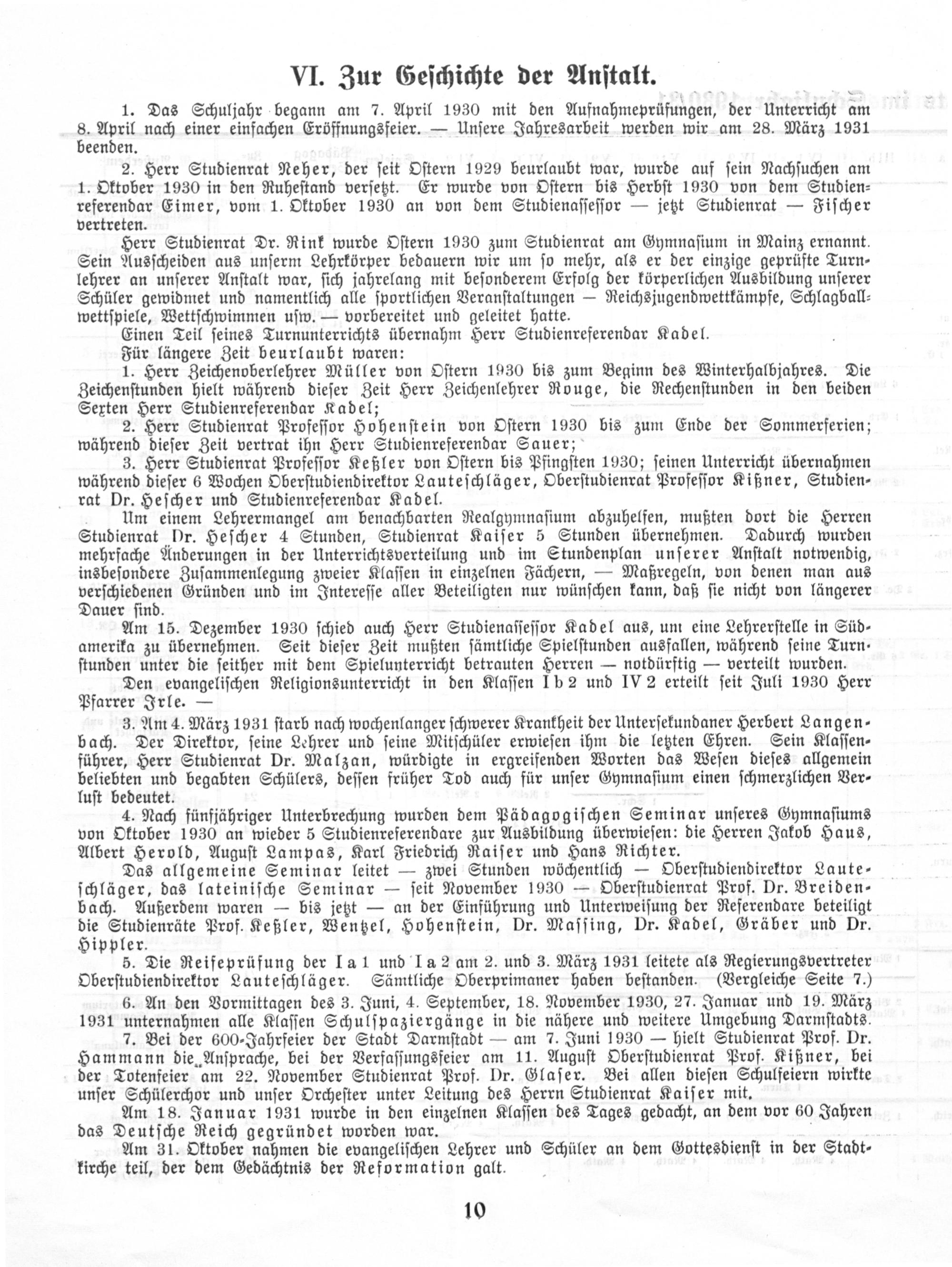 3. Herr Studienrat Profeſſor Keßler von Oſtern bis Pfingſten 1930; ſeinen Unterricht übernahmen während dieſer 6 Wochen Oberſtudiendirektor Lauteſchläger, Oberſtudienrat Profeſſor Kißner, Studien⸗ rat Dr. Heſcher und Studienreferendar Kadel.