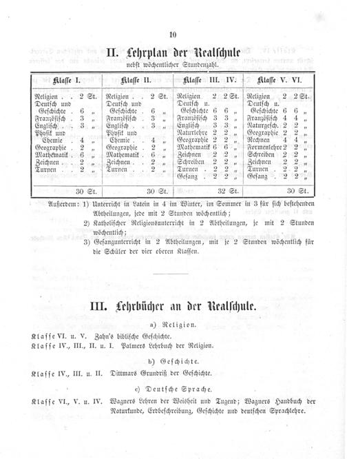 Außerdem: 1) Unterricht in Latein in 4 im Winter, im Sommer in 3 für ſich beſtehenden Abtheilungen, jede mit 2 Stunden wöchentlich; 2) Katholiſcher Religionsunterricht in 2 Abtheilungen, je mit 2 Stunden wöchentlich; 3) Geſangunterricht in 2 Abtheilungen, mit je 2 Stunden wöchentlich für die Schüler der vier oberen Klaſſen.