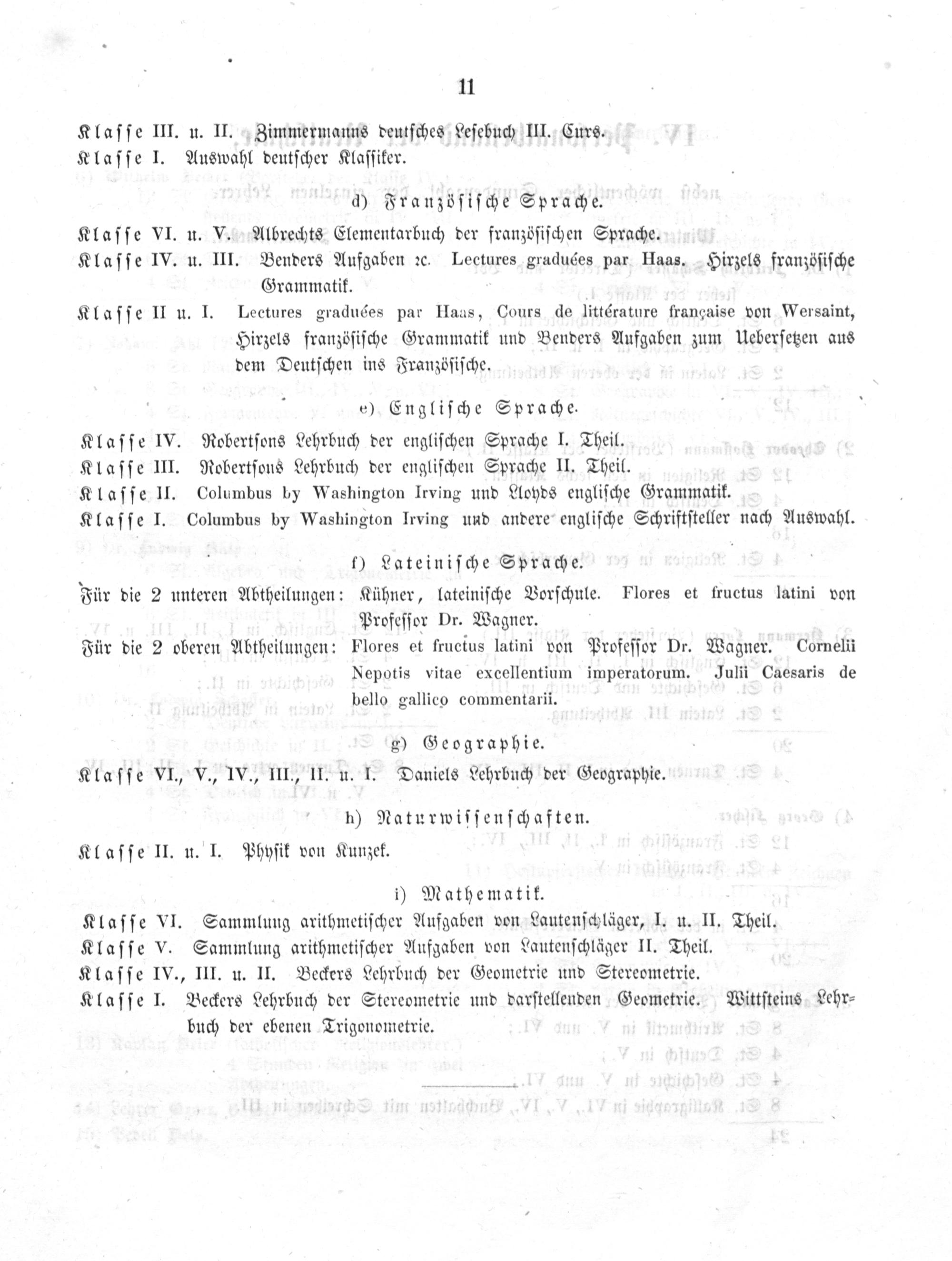 e) Engliſche Sprache. Klaſſe IV.ͤ Robertſons Lehrbuch der engliſchen Sprache I. Theil. Klaſſe III. Robertſons Lehrbuch der engliſchen Sprache II. Theil. Klaſſe II. Columbus by Washington Irving und Lloyds engliſche Grammatik. Klaſſe I. Columbus by Washington Irving und andere engliſche Schriftſteller nach Auswahl.