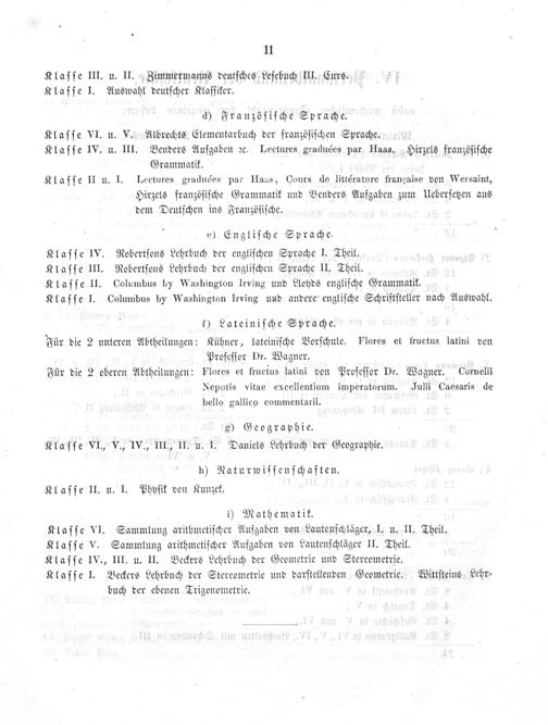 d) Franzöſiſche Sprache. Klaſſe VI. u. V. Albrechts Elementarbuch der franzöſiſchen Sprache. Klaſſe IV. u. III. Benders Aufgaben ꝛc. Lectures graduées par Haas. Hirzels franzöſiſche