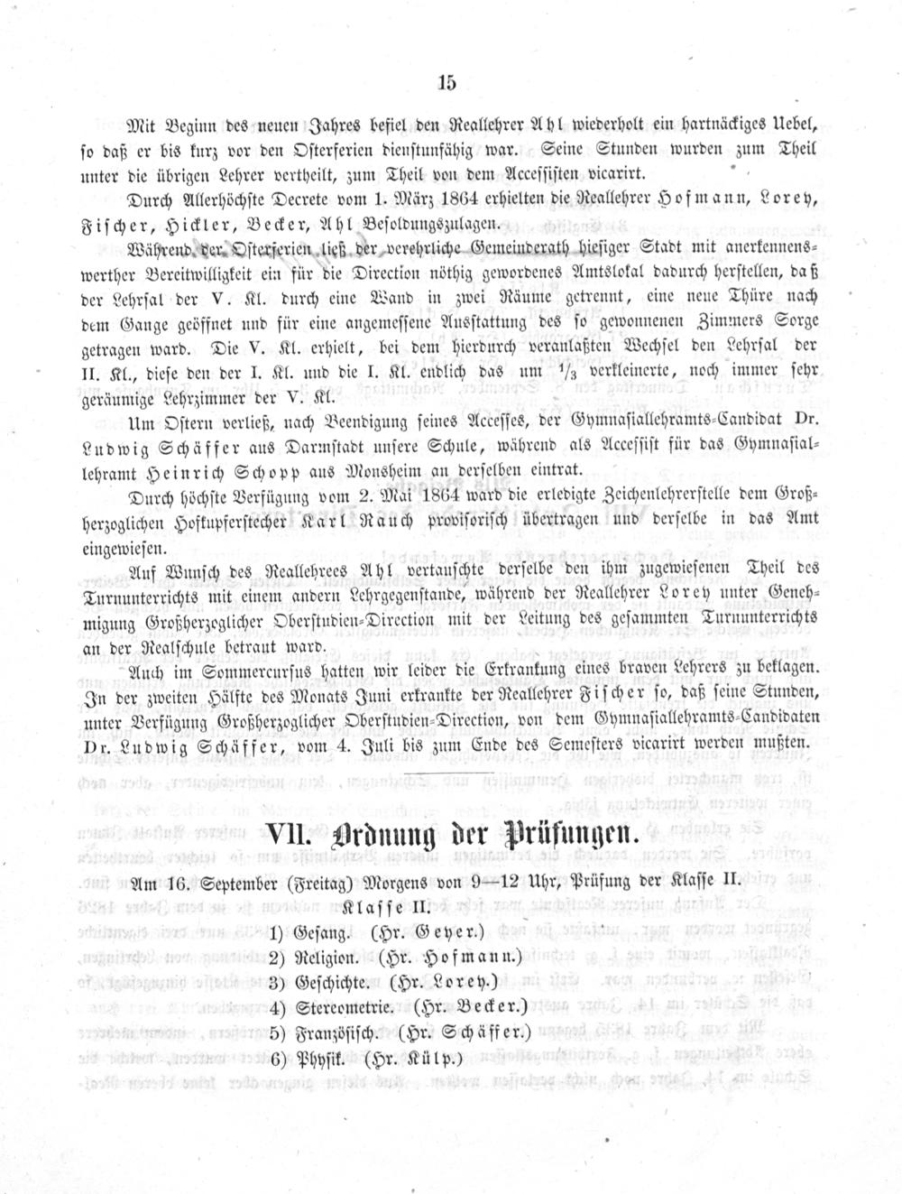 Durch Allerhöchſte Decrete vom 1. März 1864 erhielten die Reallehrer Hofmann, Lorey, Fiſcher, Hickler, Becker, Ahl Beſoldungszulagen.