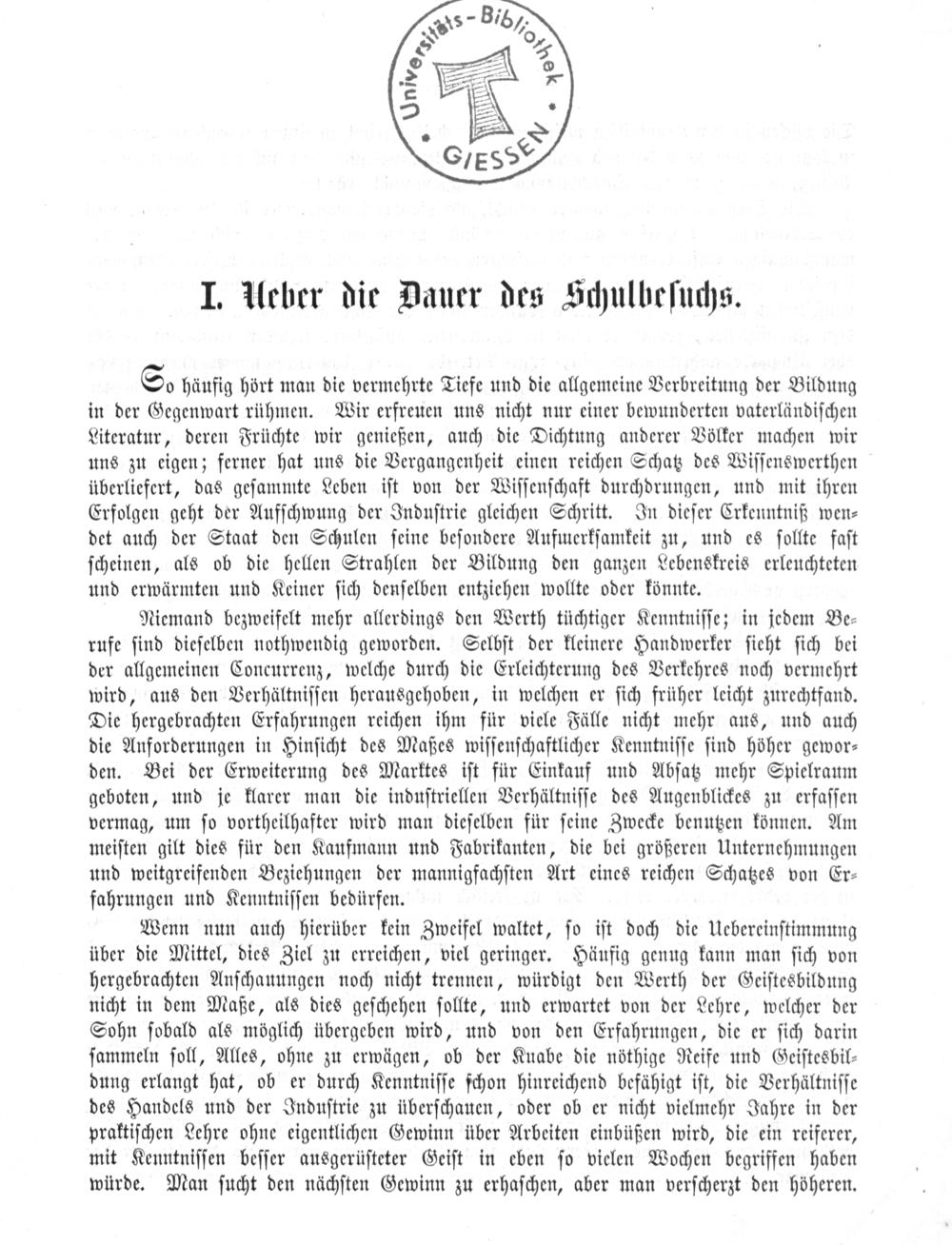 So häufig hört man die vermehrte Tiefe und die allgemeine Verbreitung der Bildung in der Gegenwart rühmen. Wir erfreuen uns nicht nur einer bewunderten vaterländiſchen Literatur, deren Früchte wir genießen, auch die Dichtung anderer Völker machen wir uns zu eigen; ferner hat uns die Vergangenheit einen reichen Schatz des Wiſſenswerthen überliefert, das geſammte Leben iſt von der Wiſſenſchaft durchdrungen, und mit ihren Erfolgen geht der Aufſchwung der Induſtrie gleichen Schritt. In dieſer Crkenntniß wen⸗ det auch der Staat den Schulen ſeine beſondere Aufuerkſamkeit zu, und es ſollte faſt ſcheinen, als ob die hellen Strahlen der Bildung den ganzen Lebenskreis erleuchteten und erwärmten und Keiner ſich denſelben entziehen wollte oder könnte.