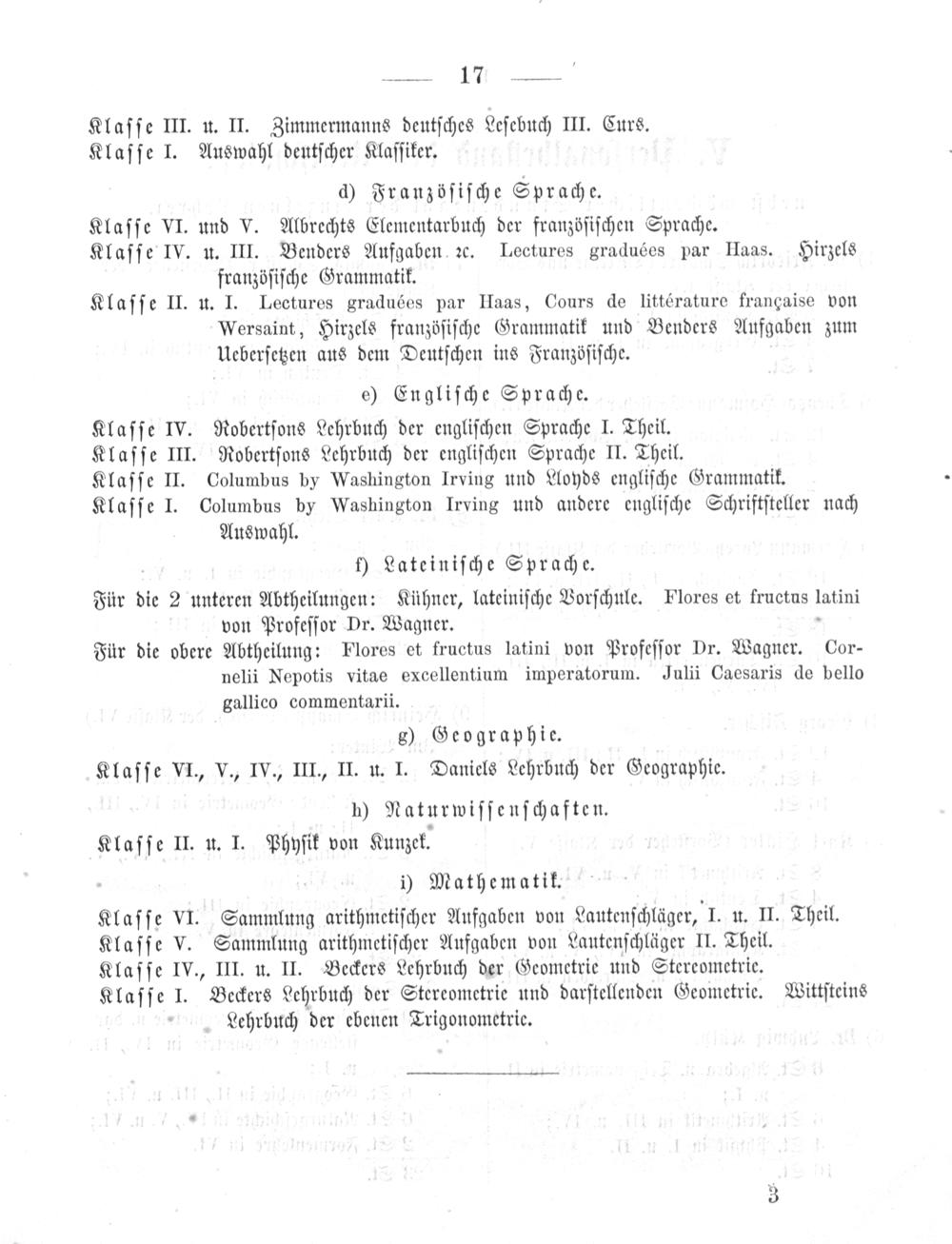 d) Franzöſiſche Sprache. Klaſſe VI. und V. Abbrechts Elementarbuch der franzöſiſchen Sprache. Klaſſe IV. u. III. Benders Aufgaben ꝛc. Lectures graduées par Haas. Hirzels franzöſiſche Grammatik. Klaſſe II. u. I. Lectures graduées par Haas, Cours de littérature française von Wersaint, Hirzels franzöſiſche Grammatik und Benders Aufgaben zum Ueberſetzen aus dem Deutſchen ins Franzöſiſche.