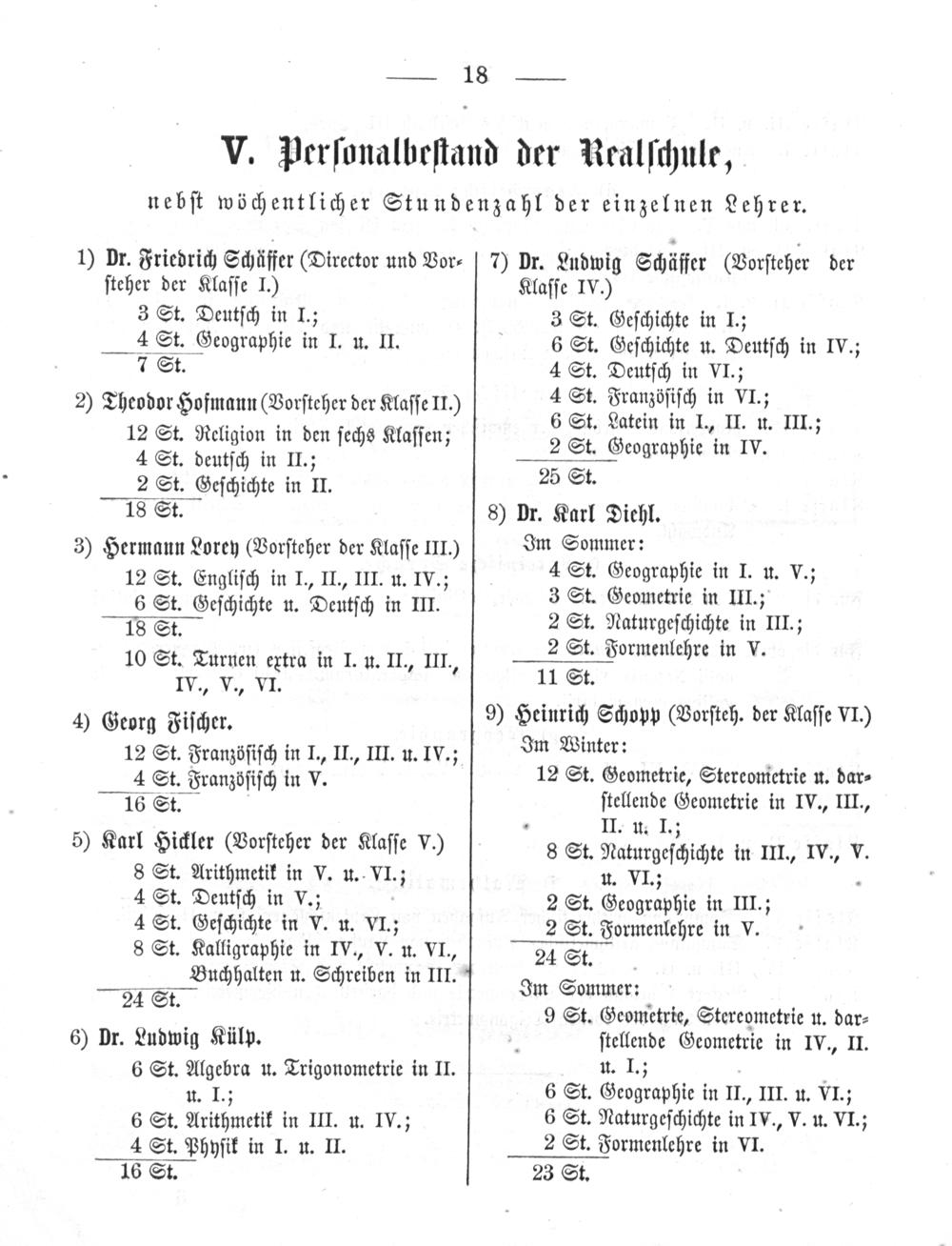 7) Dr. Ludwig Schäffer(Vorſteher der Klaſſe IV.) 3 St. Geſchichte in I.; 6 St. Geſchichte u. Deutſch in IV.; 4 St. Deutſch in VI.; 4 St. Franzöſiſch in VI.; 6 St. Latein in I., II. u. III.; 2 St. Geographie in IV.