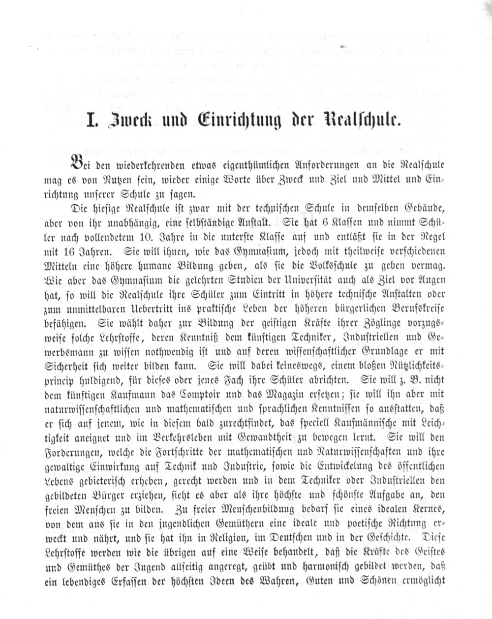Die hieſige Realſchule iſt zwar mit der techniſchen Schule in demſelben Gebäude, aber von ihr unabhängig, eine ſelbſtändige Anſtalt. Sie hat 6 Klaſſen und nimmt Schü⸗ ler nach vollendetem 10. Jahre in die unterſte Klaſſe auf und entläßt ſie in der Regel mit 16 Jahren. Sie will ihnen, wie das Gymnaſium, jedoch mit theilweiſe verſchiedenen Mitteln eine höhere humane Bildung geben, als ſie die Volksſchule zu geben vermag. Wie aber das Gymnaſium die gelehrten Studien der Univerſität auch als Ziel vor Augen hat, ſo will die Realſchule ihre Schüler zum Eintritt in höhere techniſche Anſtalten oder zum unmittelbaren Uebertritt ins praktiſche Leben der höheren bürgerlichen Berufskreiſe befähigen. Sie wählt daher zur Bildung der geiſtigen Kräfte ihrer Zöglinge vorzugs⸗ weiſe ſolche Lehrſtoffe, deren Kenntniß dem künftigen Techniker, Induſtriellen und Ge⸗ werbsmann zu wiſſen nothwendig iſt und auf deren wiſſenſchaftlicher Grundlage er mit Sicherheit ſich weiter bilden kann. Sie will dabei keineswegs, einem bloßen Nützlichkeits⸗ princip huldigend, für dieſes oder jenes Fach ihre Schüler abrichten. Sie will z. B. nicht dem künftigen Kaufmann das Comptoir und das Magazin erſetzen; ſie will ihn aber mit naturwiſſenſchaftlichen und mathematiſchen und ſprachlichen Kenntniſſen ſo ausſtatten, daß er ſich auf jenem, wie in dieſem bald zurechtfindet, das ſpeciell Kaufmänniſche mit Leich⸗ tigkeit aneignet und im Verkehrsleben mit Gewandtheit zu bewegen lernt. Sie will den Forderungen, welche die Fortſchritte der mathematiſchen und Naturwiſſenſchaften und ihre gewaltige Einwirkung auf Technik und Induſtrie, ſowie die Entwickelung des öffentlichen Lebens gebieteriſch erheben, gerecht werden und in dem Techniker oder Induſtriellen den gebildeten Bürger erziehen, ſieht es aber als ihre höchſte und ſchönſte Aufgabe an, den freien Menſchen zu bilden. Zu freier Menſchenbildung bedarf ſie eines idealen Kernes, von dem aus ſie in den jugendlichen Gemüthern eine ideale und poetiſche Richtung er⸗ weckt und nährt, und ſie hat ihn in Religion, im Deutſchen und in der Geſchichte. Dieſe Lehrſtoffe werden wie die übrigen auf eine Weiſe behandelt, daß die Kräfte des Geiſtes und Gemüthes der Jugend allſeitig angeregt, geübt und harmoniſch gebildet werden, daß ein lebendiges Erfaſſen der höchſten Ideen des Wahren, Guten und Schönen ermöglicht
