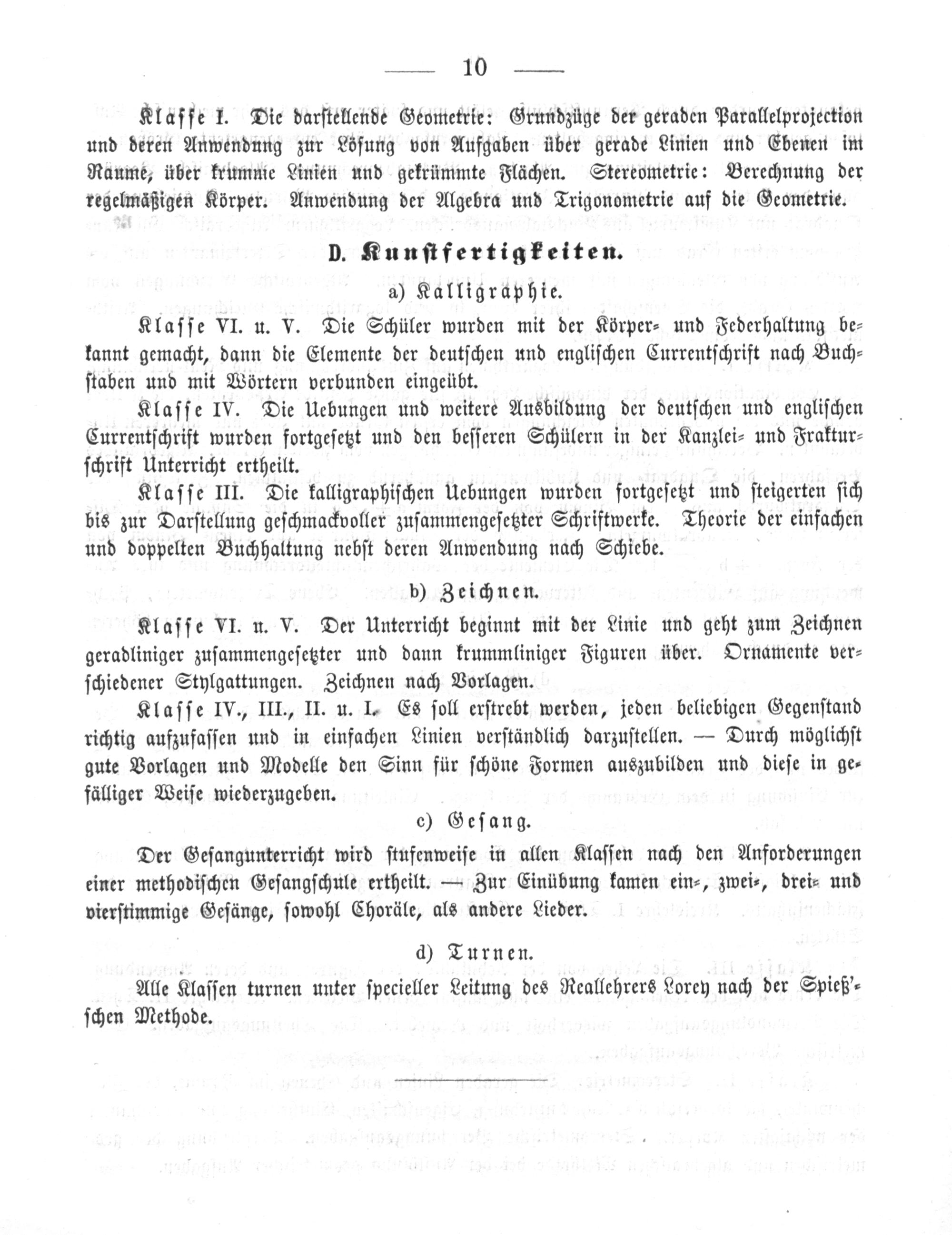 Klafſe 1. Die darſtellende Geometrie: Grundzüge der geraden Parallelprojection und deren Anwendung zur Löſung von Aufgaben über gerade Linien und Ebenen im Raume, über krumnie Linien und gekrümmte Flächen. Stereometrie: Berechnung der regelmäßigen Körper. Anwendung der Algebra und Trigonometrie auf die Geometrie.