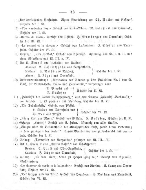 Abner: F. Jäger aus Darmſtadt, 10) Inſtrumentalvortrag:„Meditation von Gounod zu dem Präludium Nr. 1 von S. Bach, für Violon⸗Cello, Piano und Harmonium,“ vorgetragen von: 8 Lhtn Schüler der II. Kl. 11)„Heinrich's des Löwen Selbſtgeſpräch,“ aus dem Drama„Friedrich Barbaroſſa,“ von Grabbe. L. Klippſtein aus Dornberg, Schüler der II. Kl. 12)„Die Tabakspfeife,“ Gedicht von Pfeffel. L. Söder aus Darmſtadt und) S. Neu aus Meſſel Schüler der VI. Kl. 13)„König Karl am Meere,“ Gedicht von Mühler. G. Backofen, Schüler der II. Kl. 14) Geſang:„Lorelei,“ Gedicht von C. Heine. Zſtimmig von allen Klaſſen. 15)„Einiges über die Beſtandtheile der atmoſphäriſchen Luft, ſowie deren Bedeutung in dem Haushalte der Natur.“ Eigene Bearbeitung von H. Schmidt aus Lauter⸗ bach, Schüler der I. Kl. 16) Geſang:„Turnerlied von Karganiko,“ geſungen von Kl. III.—VI. 17) Act I., Scene 2 aus„Julius Cäſar,“ von Shakeſpeare: Brutus: C. Pauli aus Ober⸗Ingelheim, Cassius: F. Jäger aus Darmſtadt, Sihülct der 1. Nl 18) Geſang:„'S war einer, dem's zu Herzen ging ꝛc.,“ Gedicht von Chamiſſo. Wechſelgeſang. 19)-Le danseur de corde et le balancier,- Gedicht von Florian. A. Lautz aus Darm⸗ ſtadt, Schüler der IV. Kl. 20)„Der Geizige und der Affe,“ Gedicht von Hagedorn. S. Nathan aus Darmſtadt, Schüler der VI. Kl.