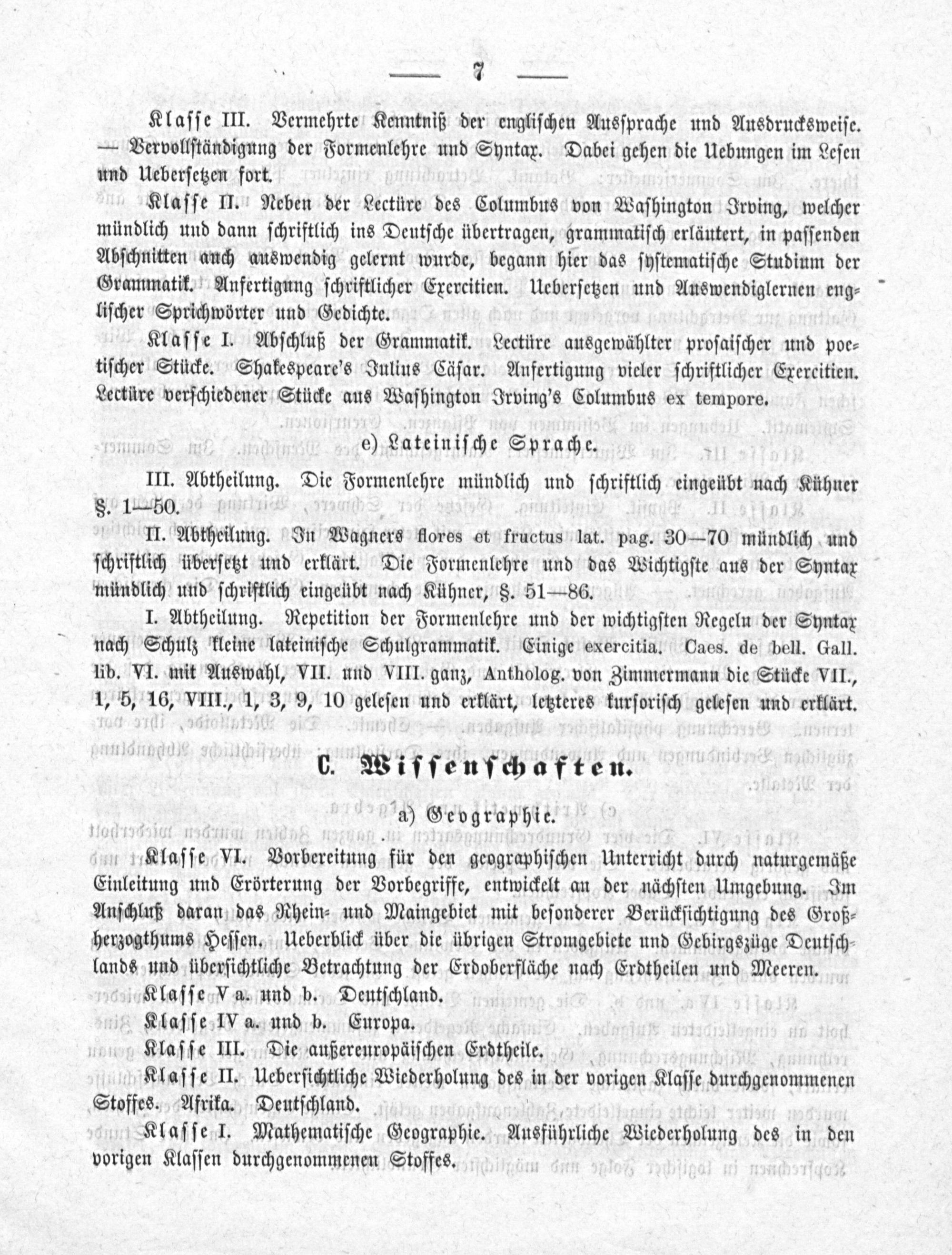 Klaſſe II. Neben der Lectüre des Columbus von Waſhington Irving, welcher mündlich und dann ſchriftlich ins Deutſche übertragen, grammatiſch erläutert, in paſſenden Abſchnitten auch auswendig gelernt wurde, begann hier das ſyſtematiſche Studium der Grammatik. Anfertigung ſchriftlicher Exercitien. Ueberſetzen und Auswendiglernen eng⸗ liſcher Sprichwörter und Gedichte.