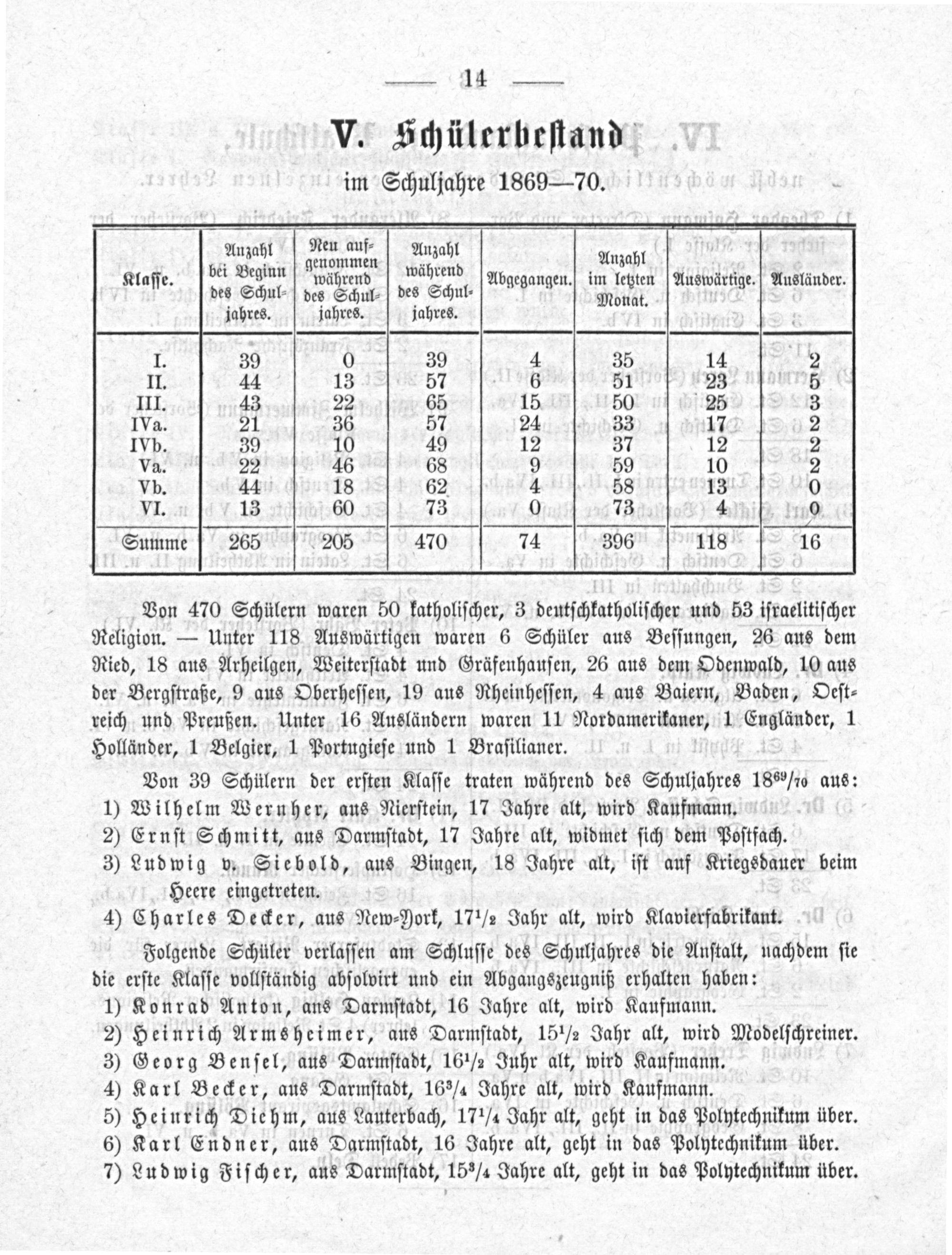 Von 39 Schülern der erſten Klaſſe traten während des Schuljahres 186⁄⁄%6 aus: 1) Wilhelm Wernher, aus Nierſtein, 17 Jahre alt, wird Kaufmann. 2) Ernſt Schmitt, aus Darmſtadt, 17 Jahre alt, widmet ſich dem Poſtfach. 3) Ludwig v. Siebold, aus Bingen, 18 Jahre alt, iſt auf Kriegsdauer beim Heere eingetreten. 4) Charles Decker, aus New⸗York, 17 ½ Jahr alt, wird Klavierfabrikant.