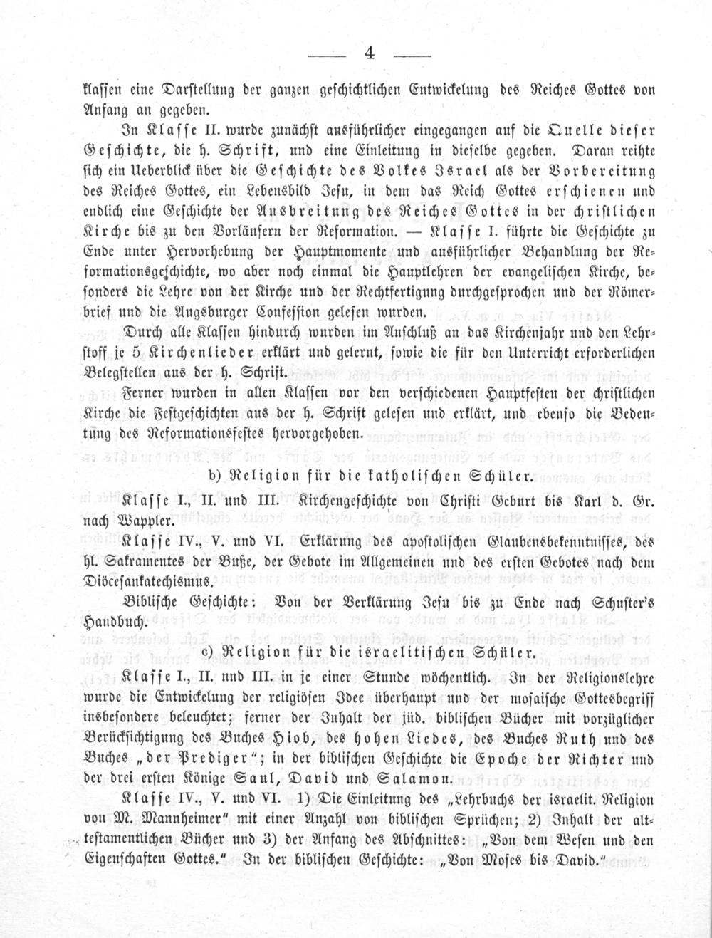 Klaſſe I., II. nnd III. in je einer Stunde wöchentlich. In der Religionslehre wurde die Entwickelung der religiöſen Idee überhaupt und der moſaiſche Gottesbegriff insbeſondere beleuchtet; ferner der Inhalt der jüd. bibliſchen Bücher mit vorzüglicher Berückſichtigung des Buches Hiob, des hohen Liedes, des Buches Ruth und des Buches„der Prediger“; in der bibliſchen Geſchichte die Epoche der Richter und der drei erſten Könige Saul, David und Salamon.