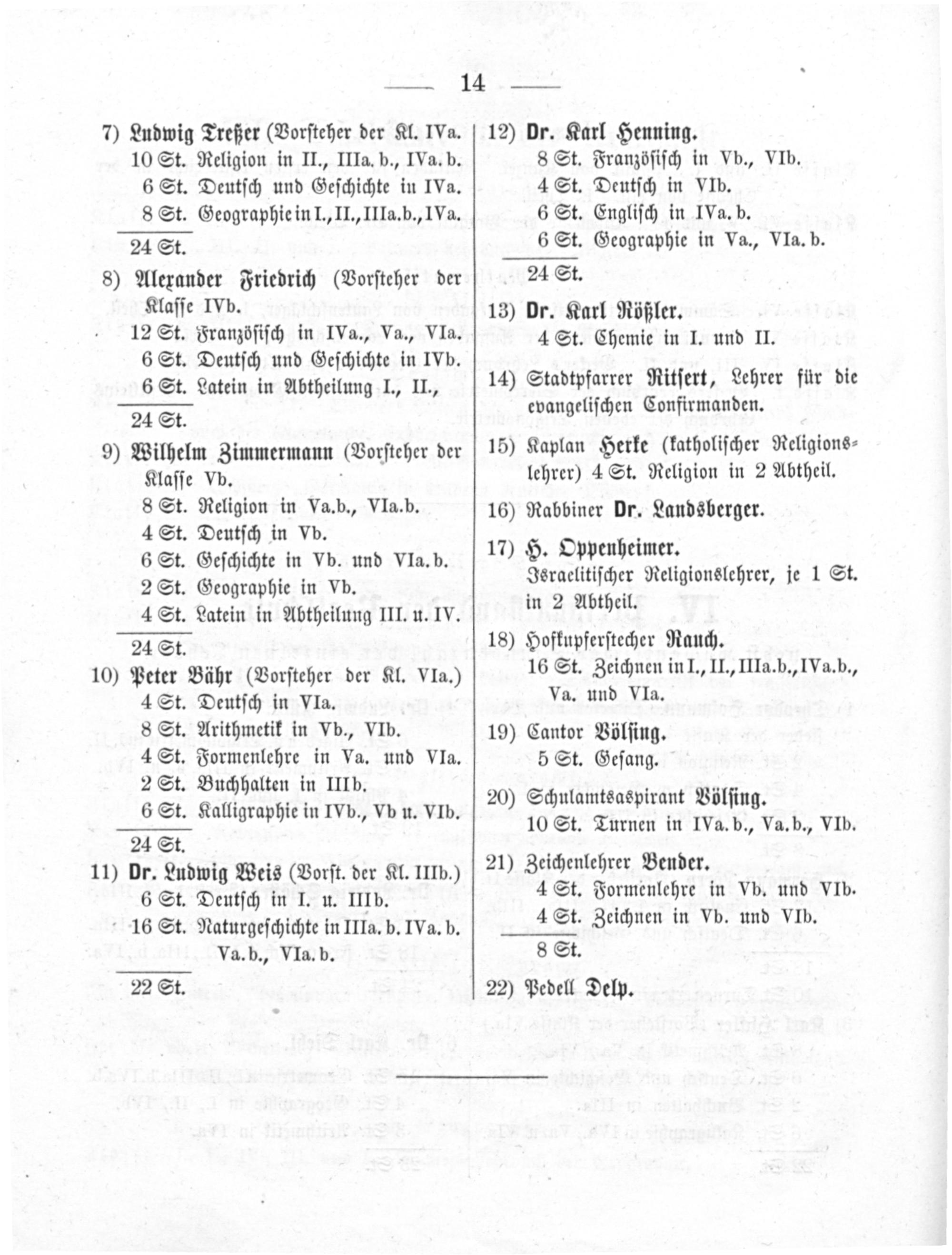 8) Alexander Friedrich(Vorſteher der Klaſſe IVb. 12 St. Franzöſiſch in IVa., Va., VIa. 6 St. Deutſch und Geſchichte in IVb. 6 St. Latein in Abtheilung I., II., 24 St. 9) Wilhelm Zimmermann(Vorſteher der Klaſſe Vb. 8 St. Religion in Va. b., VIa. b. 4 St. Deutſch in Vb. 6 St. Geſchichte in Vb. und VIa. b. 2 St. Geographie in Vb. 4 St. Latein in Abtheilung III. u. IV.