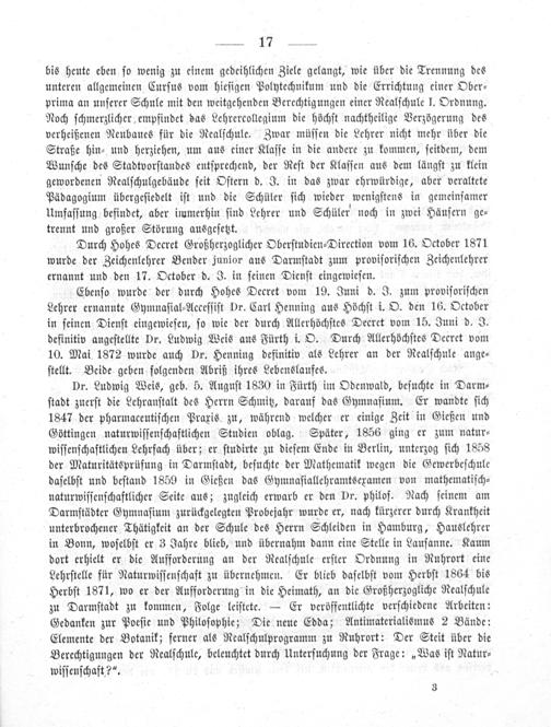 Dr. Ludwig Weis, geb. 5. Auguſt 1830 in Fürth im Odenwald, beſuchte in Darm⸗ ſtadt zuerſt die Lehranſtalt des Herrn Schmitz, daranf das Gymnaſium. Er wandte ſich 1847 der pharmaceutiſchen Praxis zu, während welcher er einige Zeit in Gießen und Göttingen naturwiſſenſchaftlichen Studien oblag. Später, 1856 ging er zum natur⸗ wiſſenſchaftlichen Lehrfach über; er ſtudirte zu dieſem Ende in Berlin, unterzog ſich 1858 der Maturitätsprüfung in Darmſtadt, beſuchte der Mathematik wegen die Gewerbeſchule daſelbſt und beſtand 1859 in Gießen das Gymnaſiallehramtsexamen von mathematiſch⸗ naturwiſſenſchaftlicher Seite aus; zugleich erwarb er den Dr. philoſ. Nach ſeinem am Darmſtädter Gymnaſium zurückgelegten Probejahr wurde er, nach kürzerer durch Krankheit unterbrochener Thätigkeit an der Schule des Herrn Schleiden in Hamburg, Hauslehrer in Bonn, woſelbſt er 3 Jahre blieb, und übernahm dann eine Stelle in Lauſanne. Kaum dort erhielt er die Aufforderung an der Realſchule erſter Ordnung in Ruhrort eine Lehrſtelle für Naturwiſſenſchaft zu übernehmen. Er blieb daſelbſt vom Herbſt 1864 bis Herbſt 1871, wo er der Aufforderung in die Heimath, an die Großherzogliche Realſchule zu Darmſtadt zu kommen, Folge leiſtete.— Er veröffentlichte verſchiedene Arbeiten: Gedanken zur Poeſie und Philoſophie; Die neue Edda; Antimaterialismus 2 Bände: Elemente der Botanik; ferner als Realſchulprogramm zu Ruhrort: Der Steit über die Berechtigungen der Realſchule, beleuchtet durch Unterſuchung der Frage:„Was iſt Natur⸗ wiſſenſchaft?“.