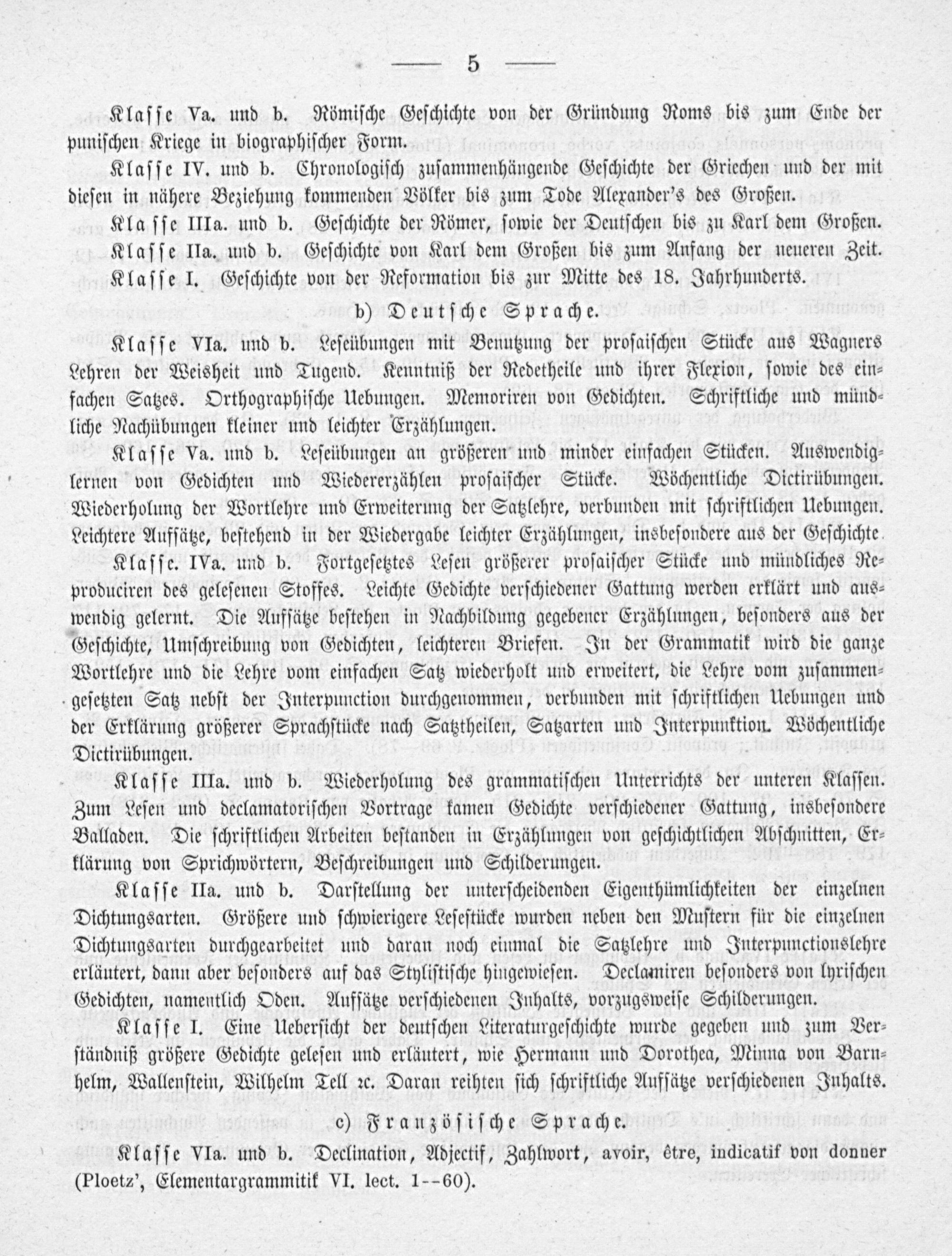 Klaſſe Va. und b. Leſeübungen an größeren und minder einfachen Stücken. Auswendig⸗ lernen von Gedichten und Wiedererzählen proſaiſcher Stücke. Wöchentliche Dictirübungen. Wiederholung der Wortlehre und Erweiterung der Satzlehre, verbunden mit ſchriftlichen Uebungen. Leichtere Aufſätze, beſtehend in der Wiedergabe leichter Erzählungen, insbeſondere aus der Geſchichte