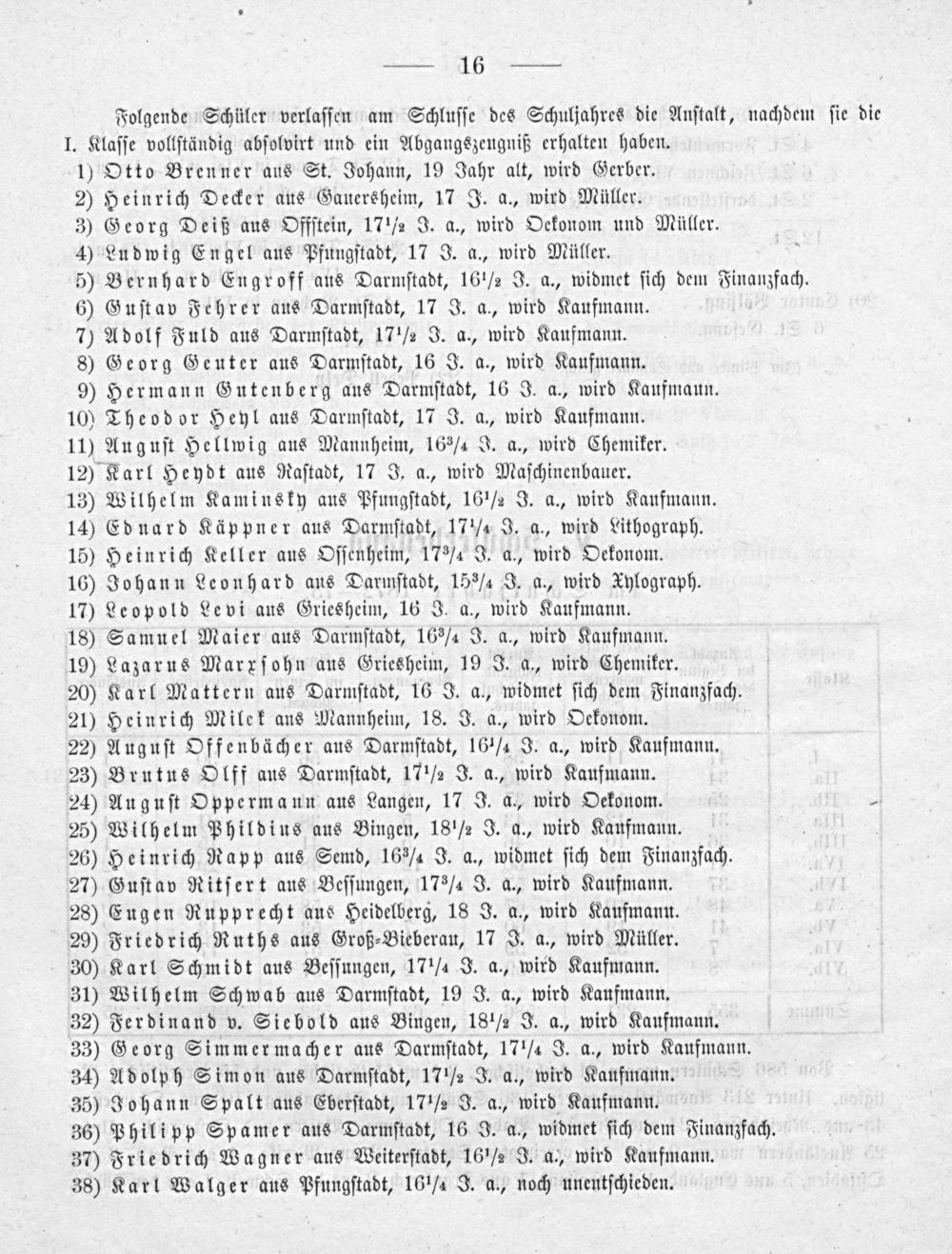 36) Philipp Spamer aus Darmſtadt, 16 J. a., widmet ſich dem Finanzfach. 37) Friedrich Wagner aus Weiterſtadt, 16 ½ J. a., wird Kaufmann.