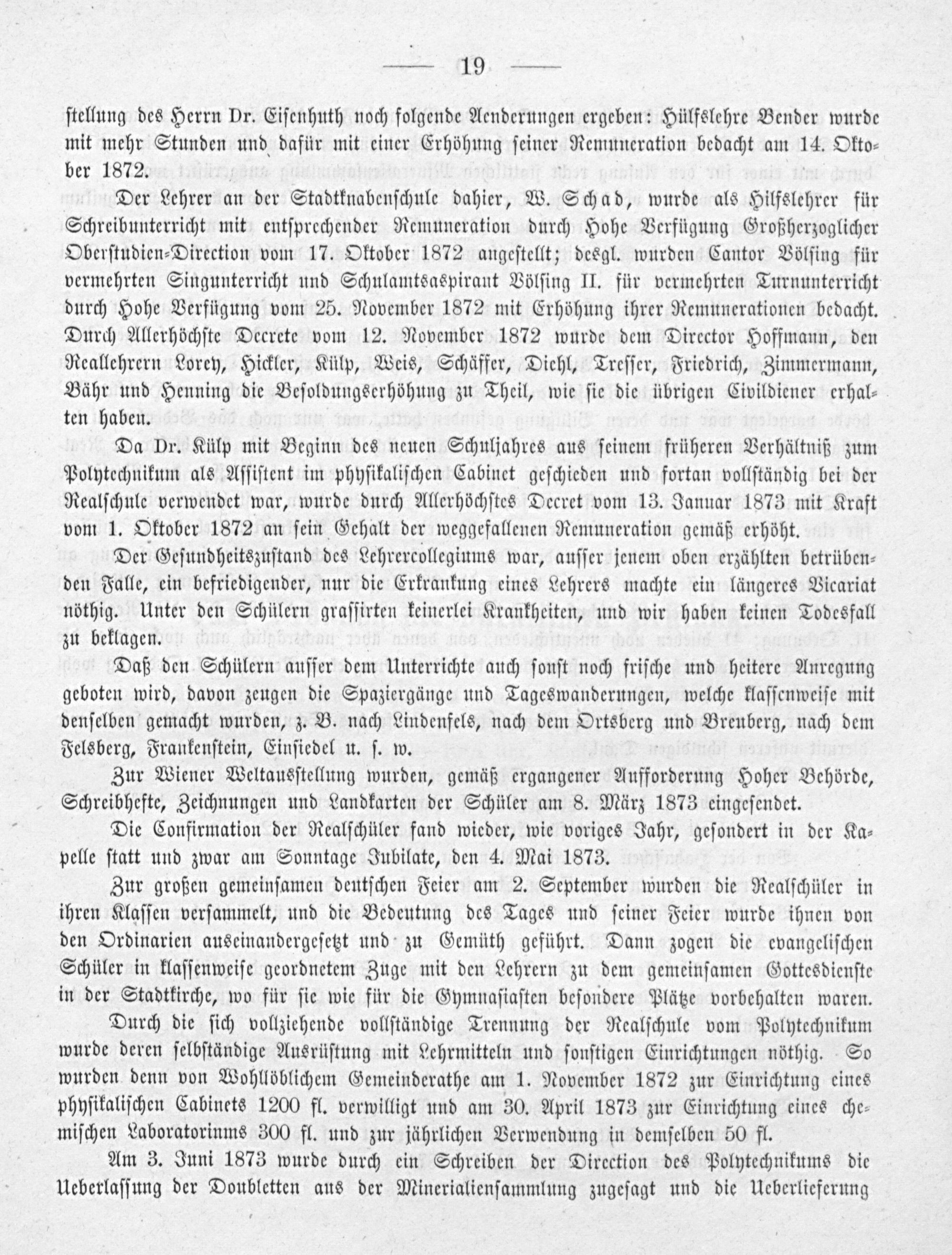 Da Dr. Külp mit Beginn des neuen Schuljahres aus ſeinem früheren Verhältniß zum Polytechnikum als Aſſiſtent im phyſikaliſchen Cabinet geſchieden und fortan vollſtändig bei der Realſchule verwendet war, wurde durch Allerhöchſtes Decret vom 13. Januar 1873 mit Kraft vom 1. Oktober 1872 an ſein Gehalt der weggefallenen Remuneration gemäß erhöht.