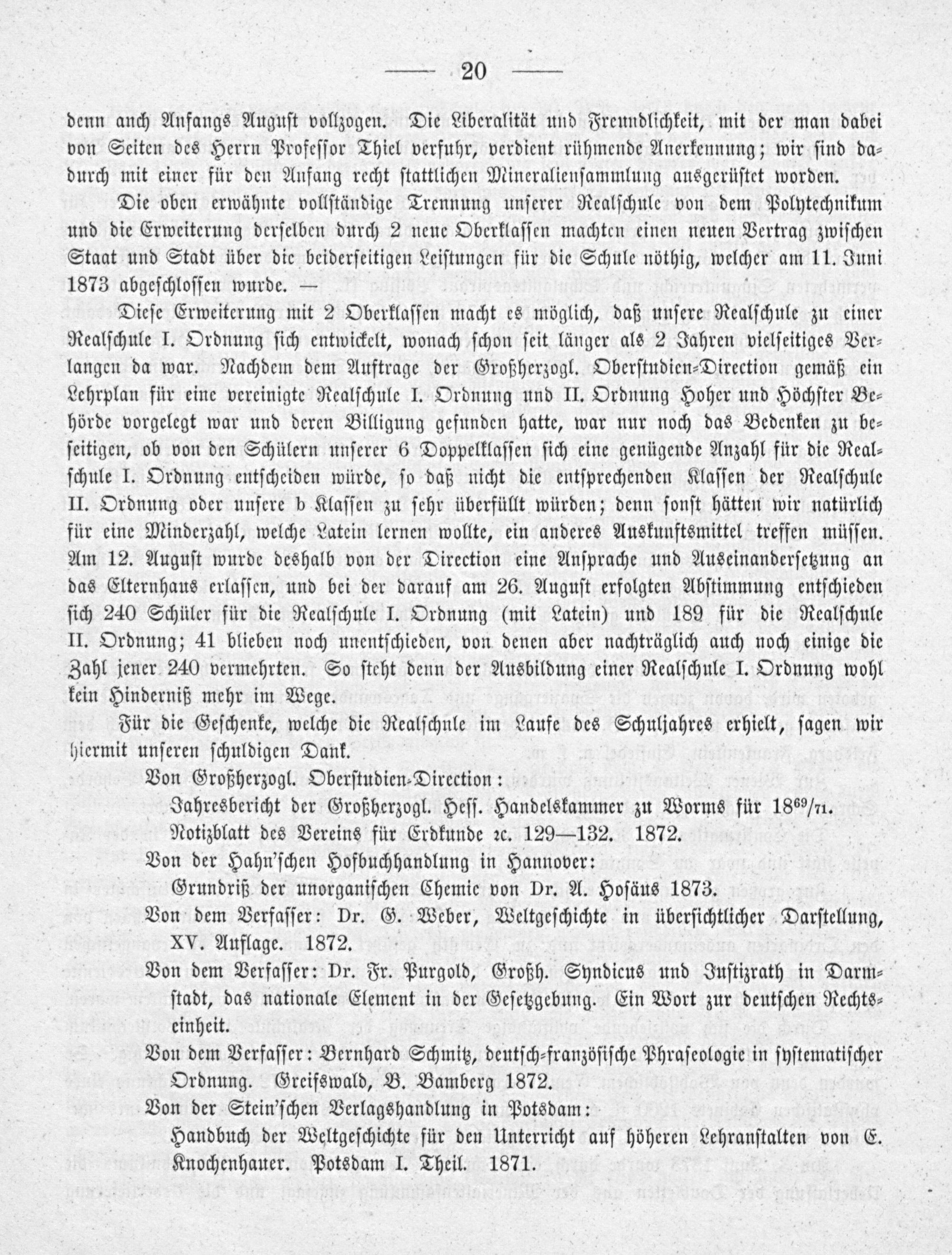 Die oben erwähnte vollſtändige Trennung unſerer Realſchule von dem Polytechnikum und die Erweiterung derſelben durch 2 neue Oberklaſſen machten einen neuen Vertrag zwiſchen Staat und Stadt über die beiderſeitigen Leiſtungen für die Schule nöthig, welcher am 11. Juni 1873 abgeſchloſſen wurde.—