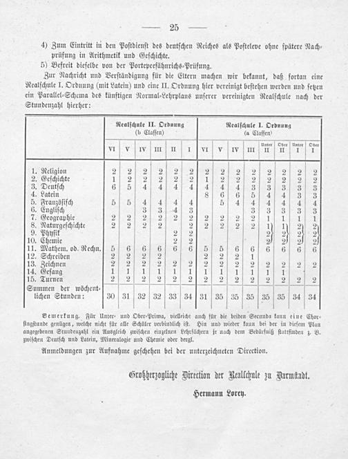 Zur Nachricht und Verſtändigung für die Eltern machen wir bekannt, daß fortan eine Realſchule I. Ordnung(mit Latein) und eine II. Ordnung hier vereinigt beſtehen werden und ſetzen ein Parallel⸗Schema des künftigen Normal⸗Lehrplans unſerer vereinigten Realſchule nach der Stundenzahl hierher: