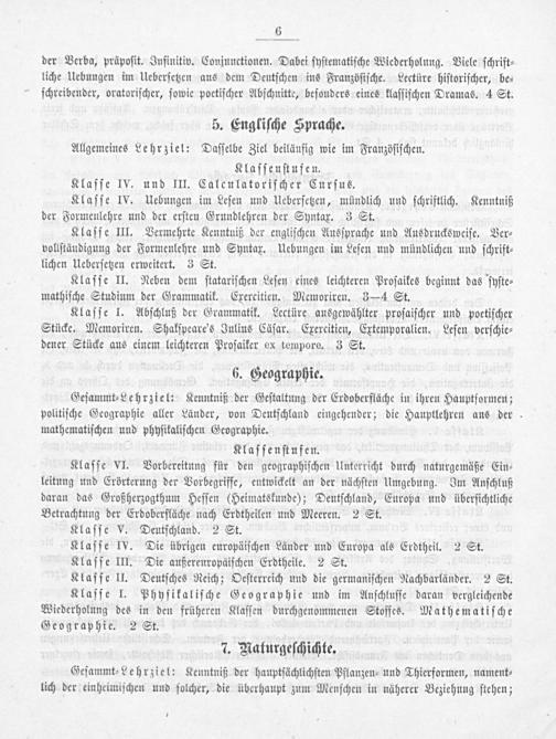 Klaſſe III. Vermehrte Kenntniß der engliſchen Ausſprache und Ausdrucksweiſe. Ver⸗ vollſtändigung der Formenlehre und Syntax. Uebungen im Leſen und mündlichen und ſchrift⸗ lichen Ueberſetzen erweitert. 3 St.
