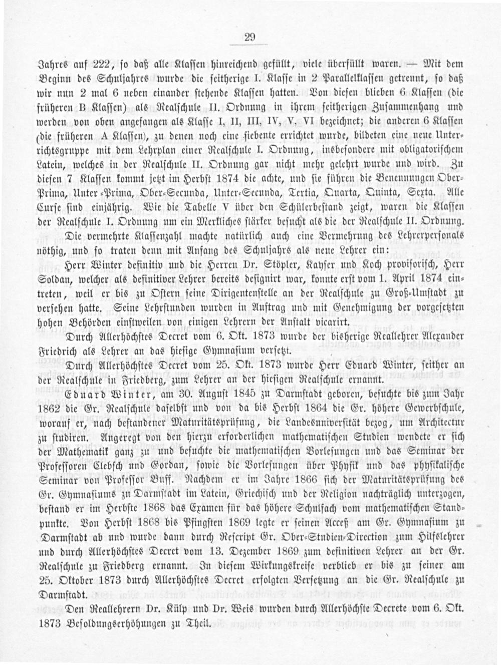 Durch Allerhöchſtes Decret vom 25. Okt. 1873 wurde Herr Eduard Winter, ſeither an der Realſchule in Friedberg, zum Lehrer an der hieſigen Realſchule ernannt.
