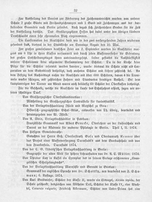 Zur großen gemeinſamen deutſchen Feier am 2. September wurden die Realſchüler mor⸗ gens um 8 Uhr in ihren Klaſſen verſammelt und durch jeden Klaſſenvorſteher die Bedeutung des großen Entſcheidungstages ihnen auseinandergeſetzt. Leider geſtattet die Nothdürftigkeit unſerer Schulräume keine allgemeine Verſammlung der Schüler. Da in der Kirche keine Plätze für die Schüler reſervirt werden konnten, wurde diesmal die Schule nicht als Cor⸗ poration an dem Gottesdienſt betheiligt, doch wohnten Schüler und Lehrer zahlreich bei. An dem Feſtzug des Nachmittags nahm die Realſchule mit über 600 Schülern, davon 4 die Trom⸗ meln wacker ſchlugen, mit zahlreichen Fahnen und Standarten freudigen Antheil. Bei dem Lampionreigen der Turner am Abend waren auch beiläufig 60 Schüler der Oberklaſſen betheiligt.