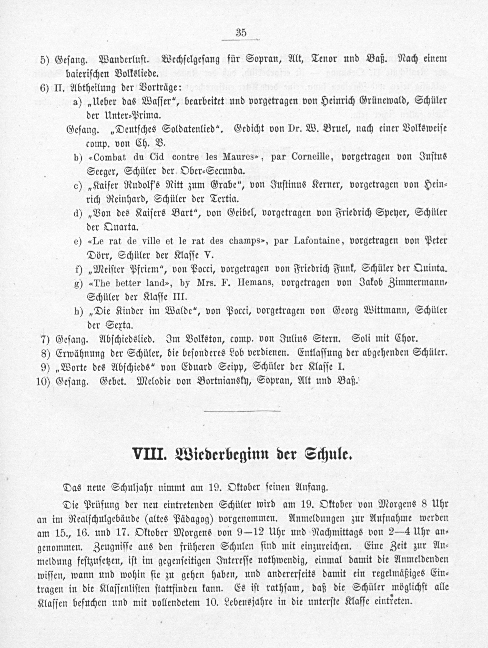 — 35— 5) Geſang. Wanderluſt. Wechſelgeſang für Sopran, Alt, Tenor und Baß. Nach einem baieriſchen Volksliede. 6) II. Abtheilung der Vorträge: a)„Ueber das Waſſer“, bearbeitet und vorgetragen von Heinrich Grünewald, Schüler der Unter⸗Prima. Geſang.„Deutſches Soldatenlied“. Gedicht von Dr. W. Bruel, nach einer Volksweiſe comp. von Ch. V. b)-Combat du Cid contre les Maures-, par Corneille, vorgetragen von Iuſtus Seeger, Schüler der Ober⸗Secunda. c)„Kaiſer Rudolſ's Ritt zum Grabe“, von Juſtinus Kerner, vorgetragen von Hein⸗ rich Reinhard, Schüler der Tertia. d)„Von des Kaiſers Bart“, von Geibel, vorgetragen von Friedrich Speyer, Schüler der Quarta. e)-Le rat de ville et le rat des champs-, par Lafontaine, vorgetragen von Peter Dörr, Schüler der Klaſſe V. †)„Meiſter Pfriem“, von Pocci, vorgetragen von Friedrich Funk, Schüler der Quinta. g) ⸗The better land⸗, by Mrs. F. Hemans, vorgetragen von Jakob Zimmermann⸗ Schüler der Klaſſe III. h)„Die Kinder im Walde“, von Pocci, vorgetragen von Georg Wittmann, Schüler der Sexta. 7) Geſang. Abſchiedslied. Im Volkston, comp. von Julius Stern. Soli mit Chor. 8) Erwähnung der Schüler, die beſonderes Lob verdienen. Entlaſſung der abgehenden Schüler. 9)„Worte des Abſchieds“ von Eduard Seipp, Schüler der Klaſſe I. 10) Geſang. Gebet. Melodie von Bortniansky, Sopran, Alt und Baß.