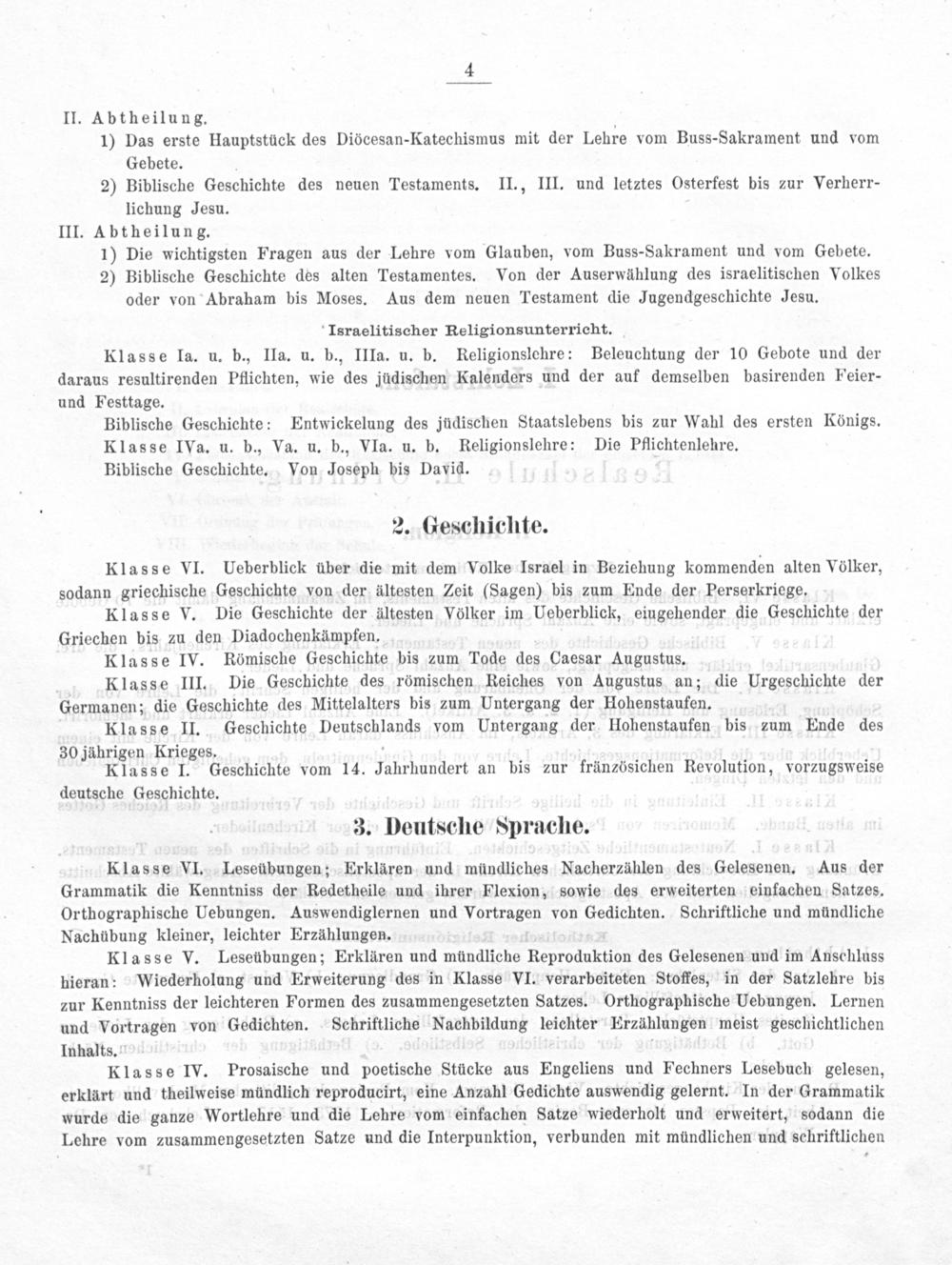II. Abtheilung.. 1) Das erste Hauptstück des Diöcesan-Katechismus mit der Lehre vom Buss-Sakrament und vom Gebete. 2) Biblische Geschichte des neuen Testaments. II., III. und letztes Osterfest bis zur Verherr- lichung Jesu. III. Abtheilung. 1) Die wichtigsten Fragen aus der Lehre vom Glauben, vom Buss-Sakrament und vom Gebete. 2) Biblische Geschichte des alten Testamentes. Von der Auserwählung des israelitischen Volkes oder von Abraham bis Moses. Aus dem neuen Testament die Jugendgeschichte Jesu.