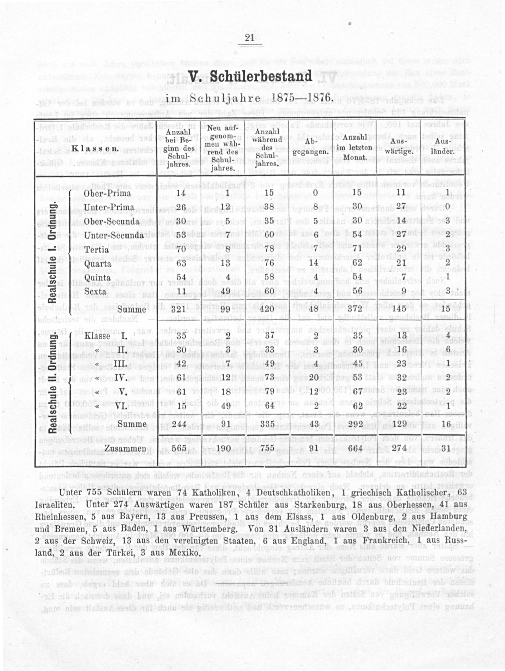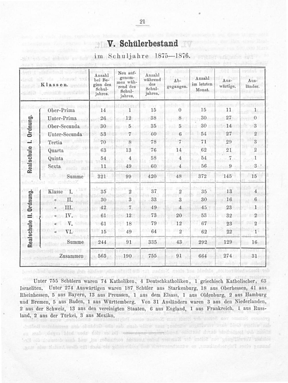 V. Schülerbestand im Schuljahre 1875—1876.