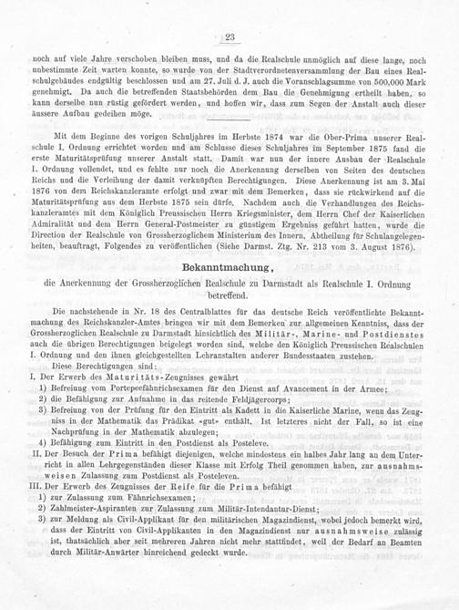Mit dem Beginne des vorigen Schuljahres im Herbste 1874 war die Ober-Prima unserer Real- schule I. Ordnung errichtet worden und am Schlusse dieses Schuljahres im September 1875 fand die erste Maturitätsprüfung unserer Anstalt statt. Damit war nun der innere Ausbau der Realschule I. Ordnung vollendet, und es fehlte nur noch die Anerkennung derselben von Seiten des deutschen Reichs und die Verleihung der damit verknüpften Berechtigungen. Diese Anerkennung ist am 3. Mai 1876 von dem Reichskanzleramte erfolgt und zwar mit dem Bemerken, dass sie rückwirkend auf die Maturitätsprüfung aus dem Herbste 1875 sein dürfe. Nachdem auch die Verhandlungen des Reichs- kanzleramtes mit dem Königlich Preussischen Herrn Kriegsminister, dem Herrn Chef der Kaiserlichen Admiralität und dem Herrn General-Postmeister zu günstigem Ergebniss geführt hatten, wurde die Direction der Realschule von Grossherzoglichem Ministerium des Innern, Abtheilung für Schulangelegen- heiten, beauftragt, Folgendes zu veröffentlichen(Siehe Darmst. Ztg. Nr. 213 vom 3. August 1876).